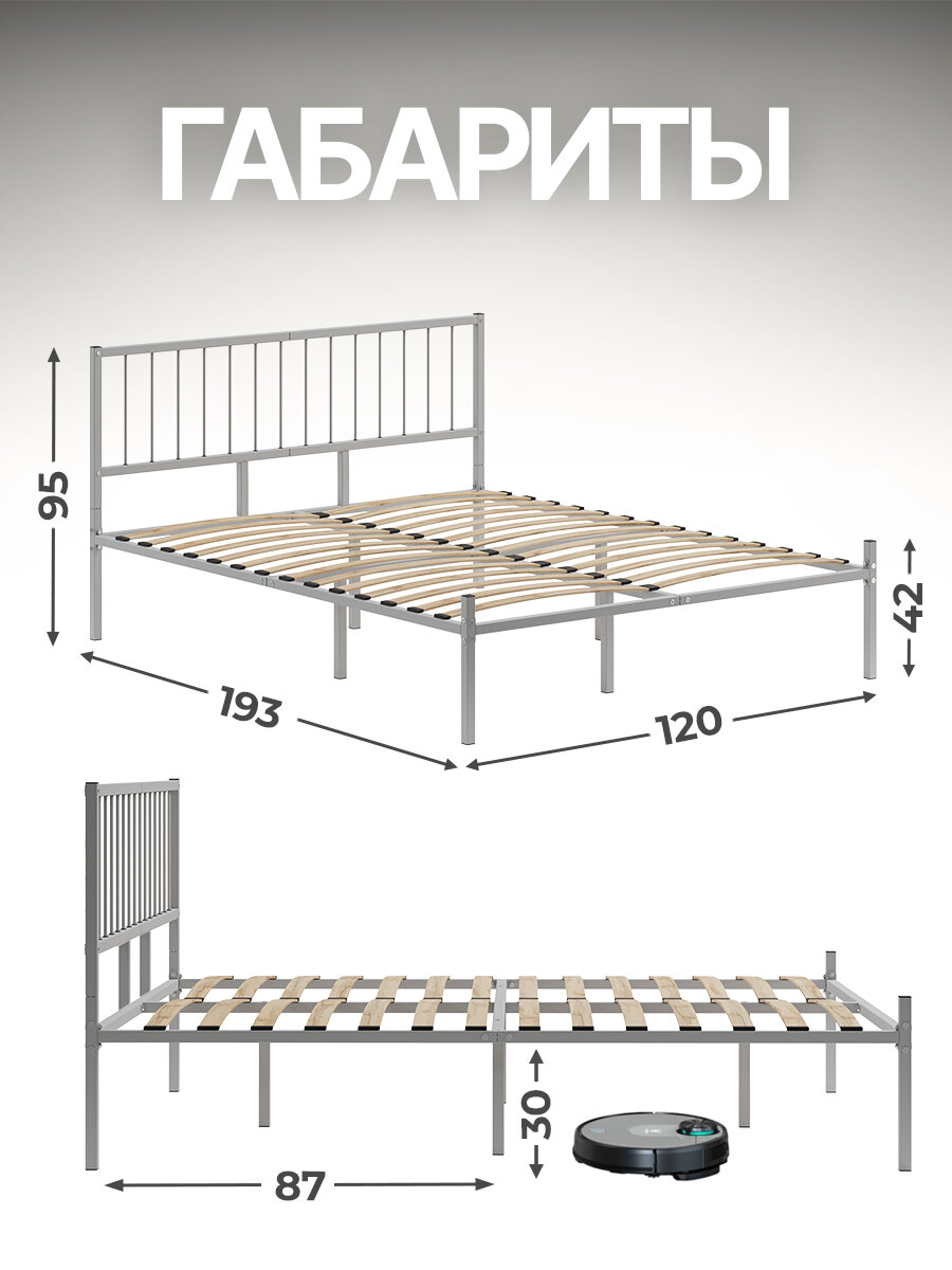 Кровать металлическая Металика Г4 120х200 серая с держателями для матраса и доп. опорами