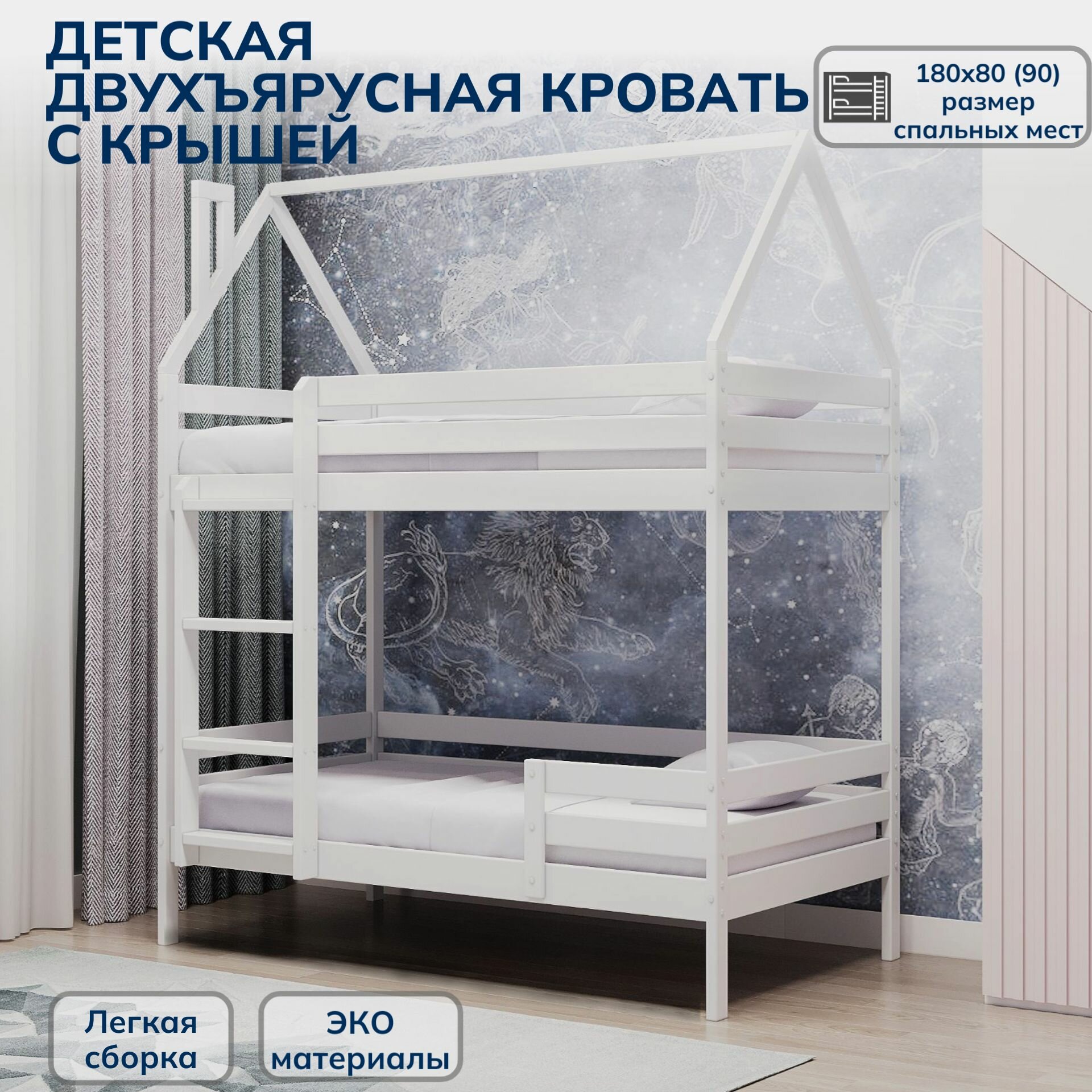 Двухъярусная кровать домик из массива березы, 180*90 , белая, экологичная детская кровать с бортом