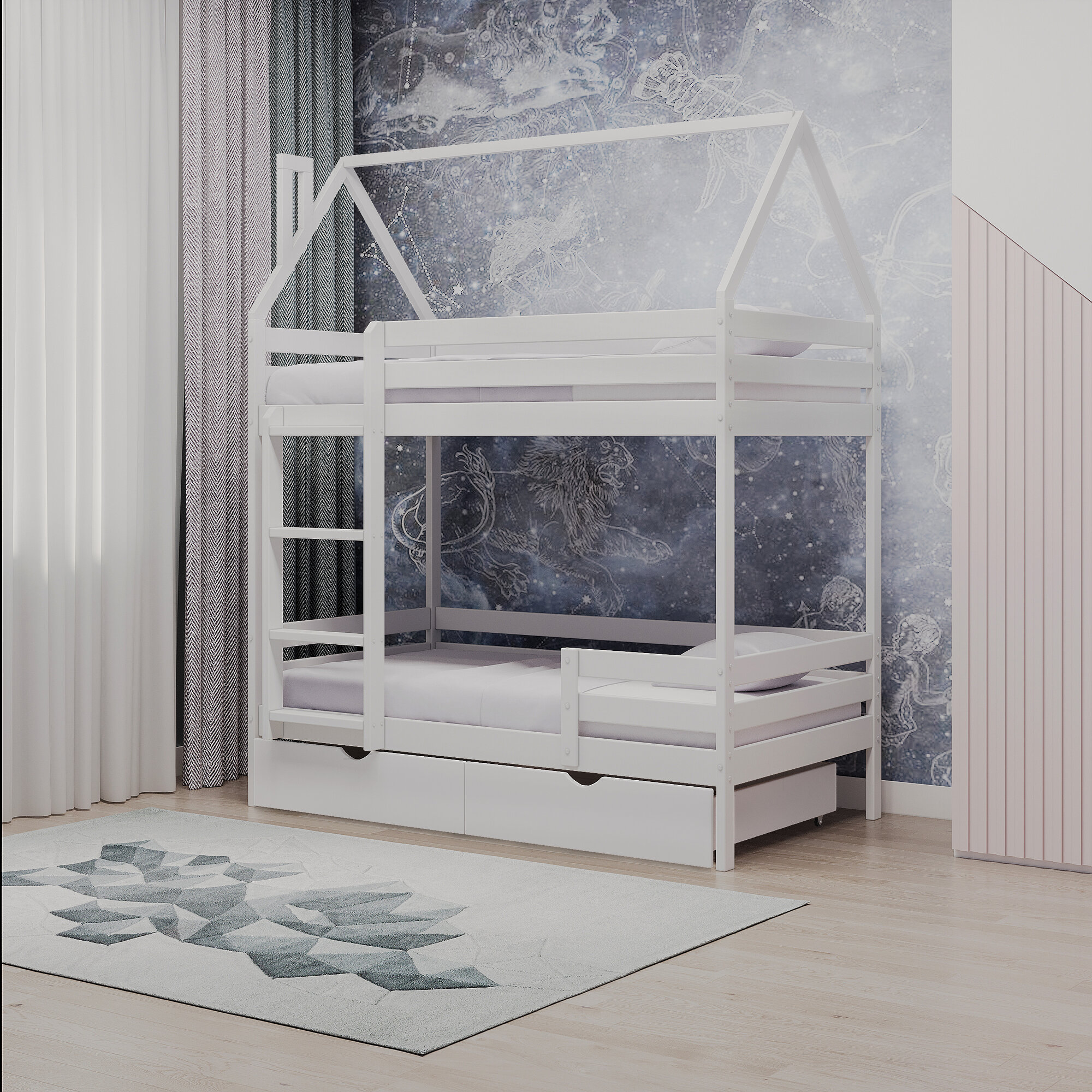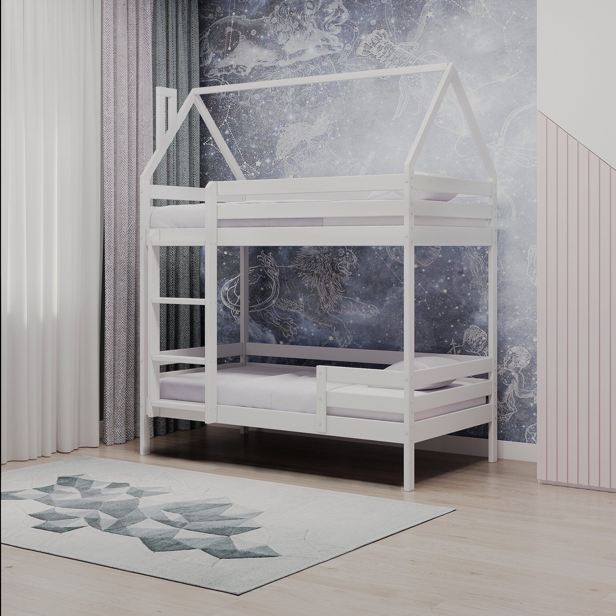 Двухъярусная кровать домик из массива березы, белая , 200*80, безопасная детская кровать
