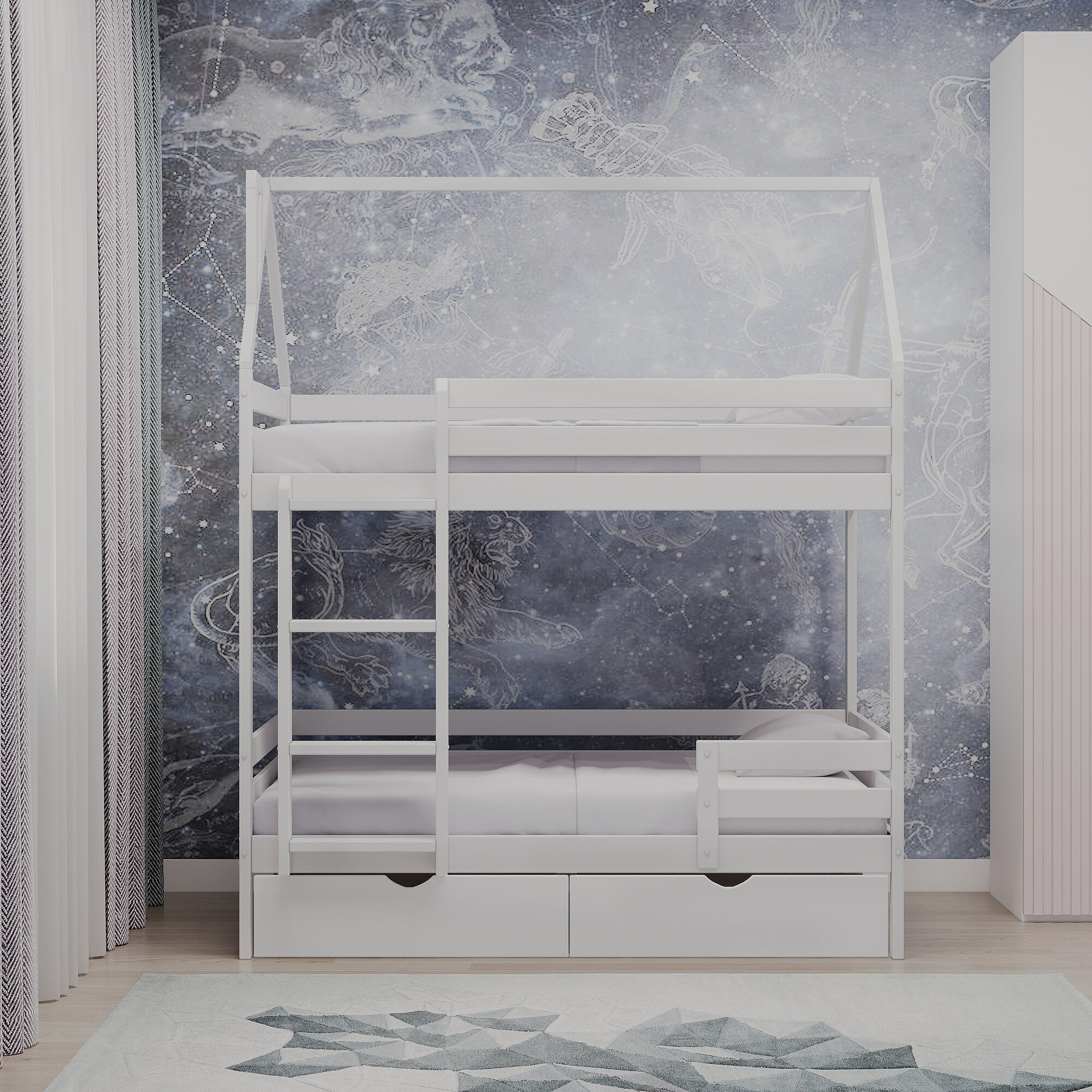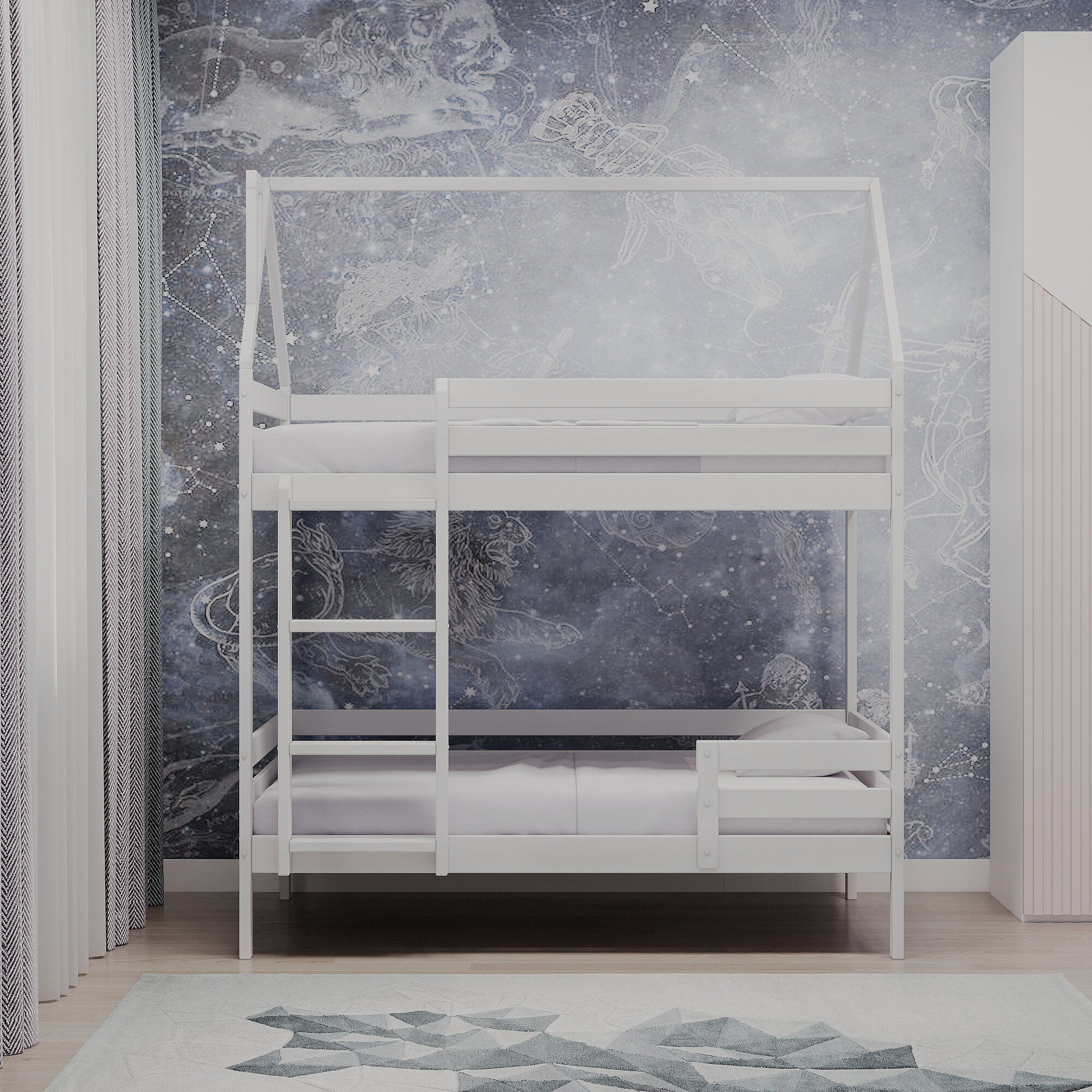 Двухъярусная кровать домик 200*90 белая массив березы, экологичная кровать