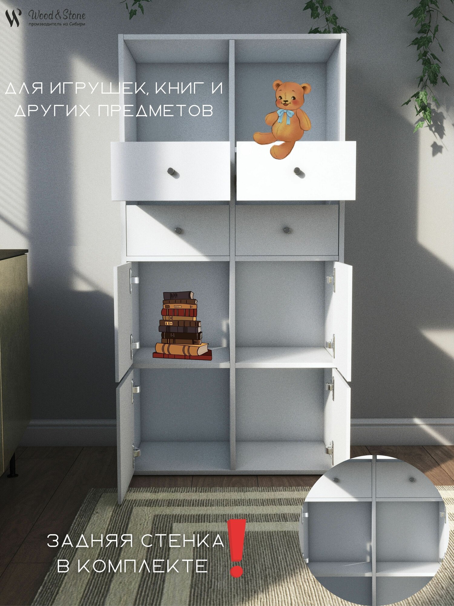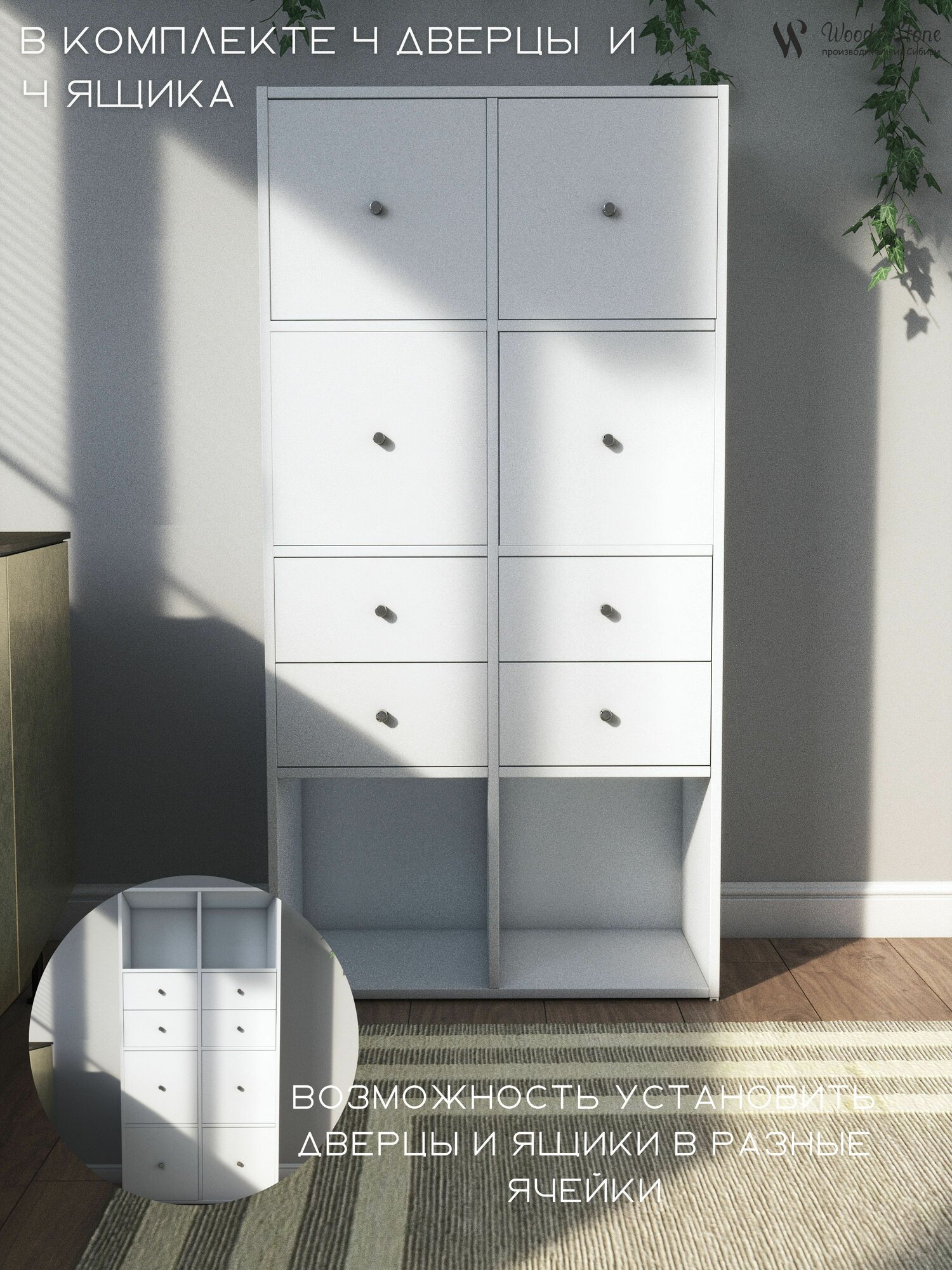 СохранитьСтеллаж (в ассортименте) с ящиками и дверцами белый " Wood&Stone 8 секций, 320 (1) интересное: