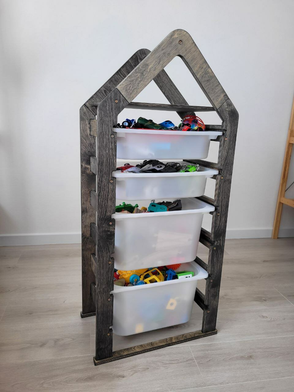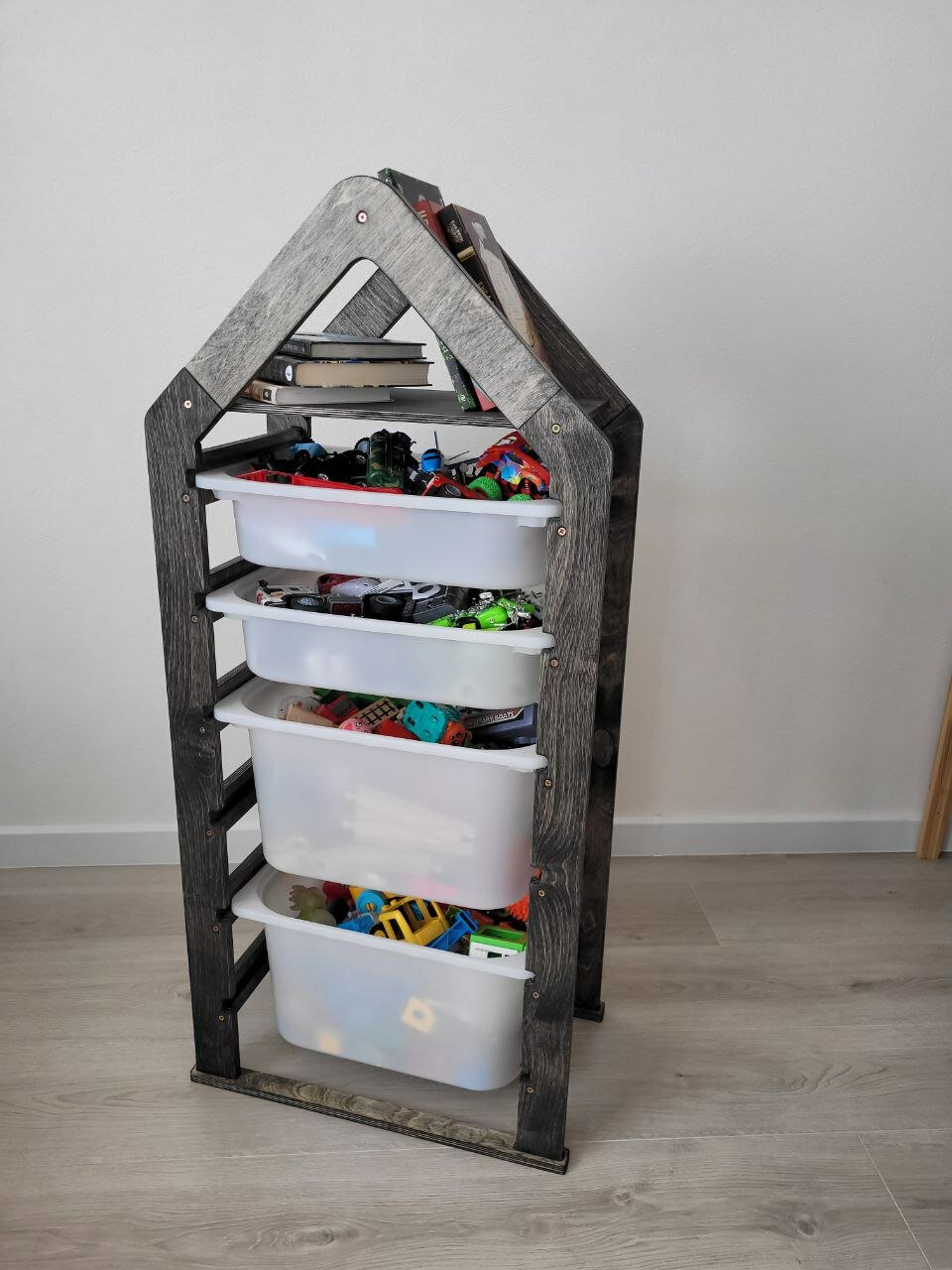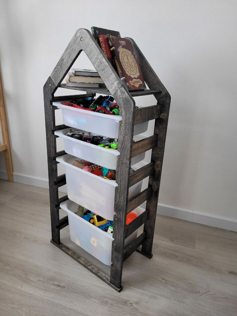 Стеллаж деревянный напольный для игрушек с полкой черный графит интересное: