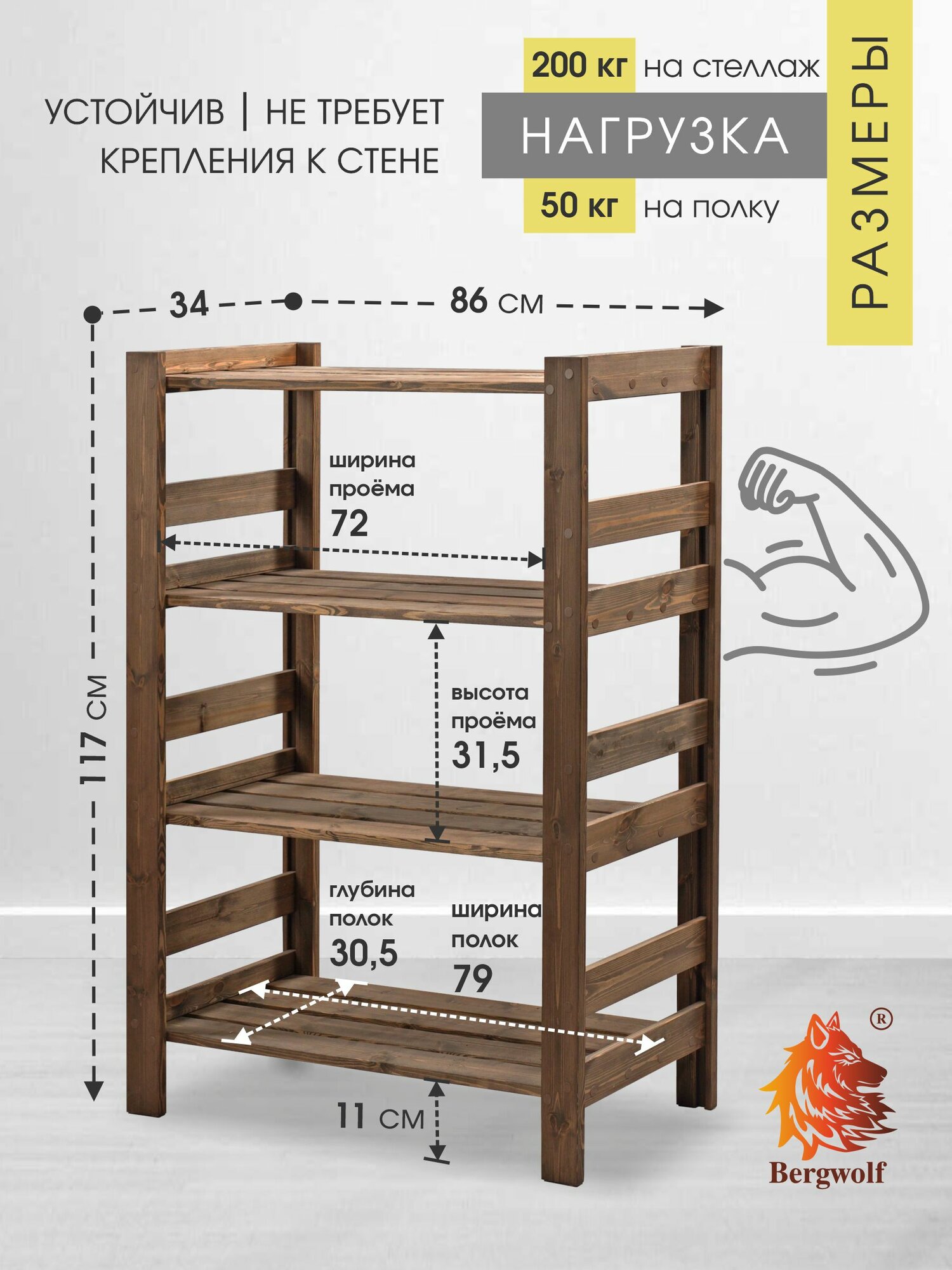 Стеллаж деревянный 117х86х34 см, покрыт маслом, 4 полки, нагрузка 200 кг