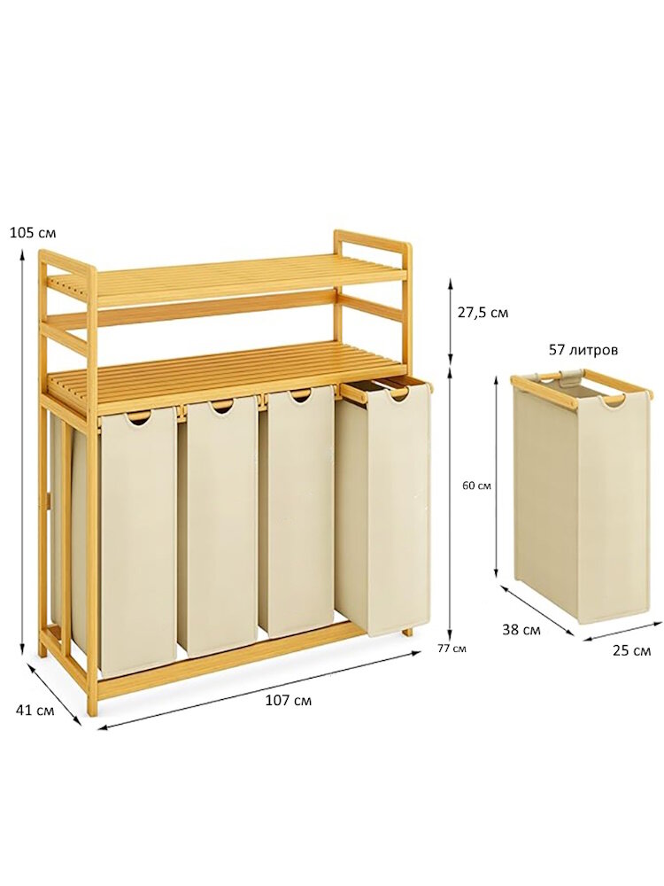 Стеллаж для ванной с корзиной для белья Bambuchka из бамбука, Этажерка для ванной, размер 80х30х95 см