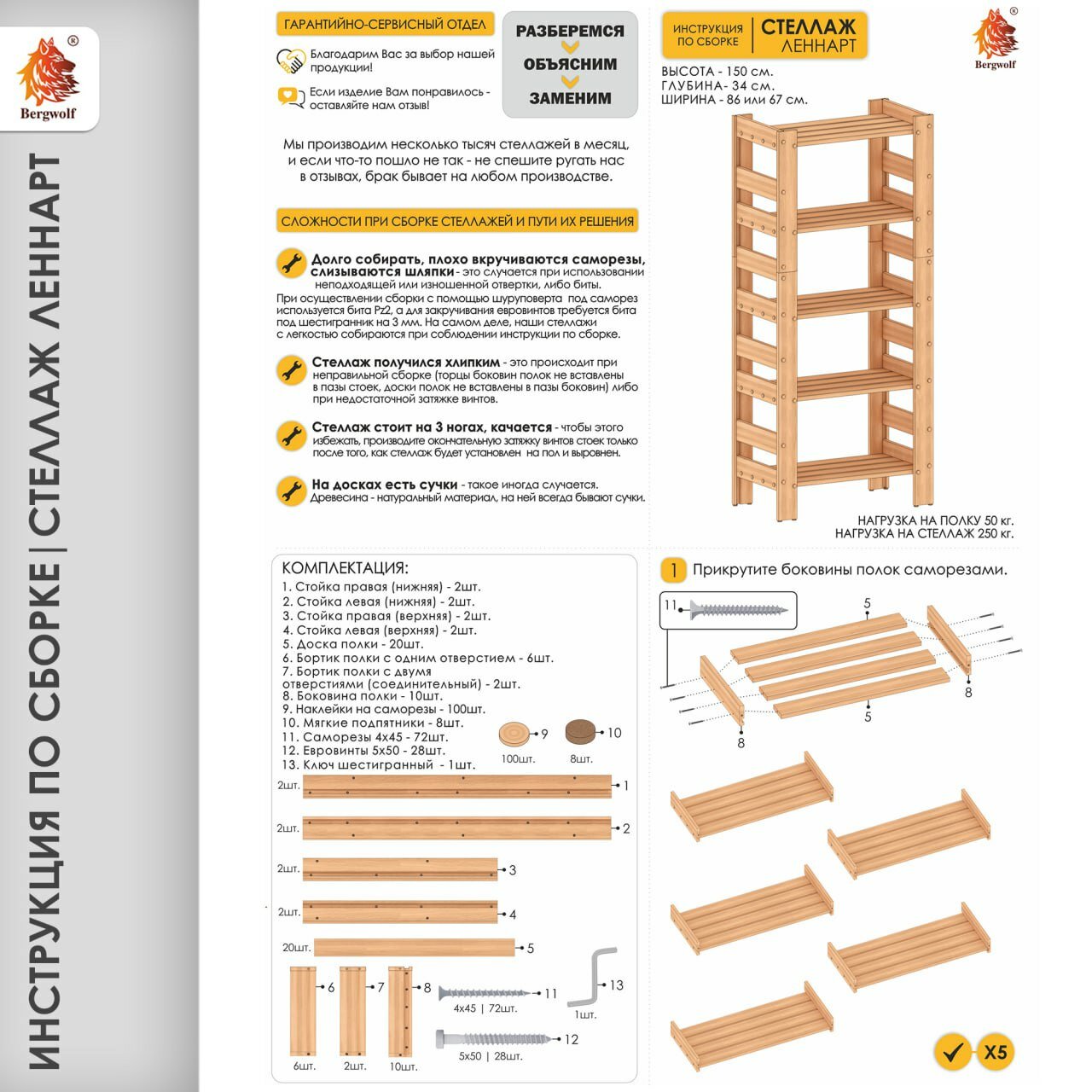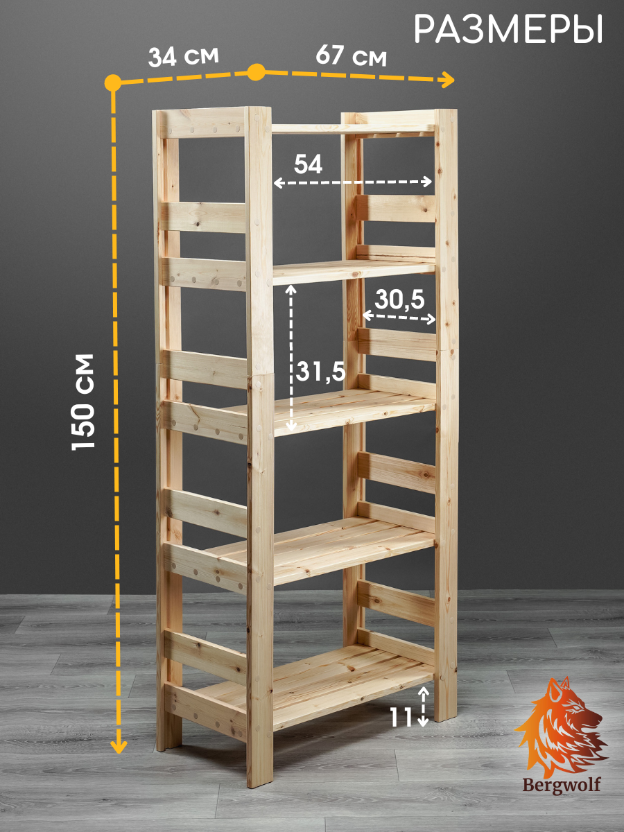 Стеллаж деревянный 150х67х34 см, отшлифован, 5 полок, нагрузка 250 кг интересное: