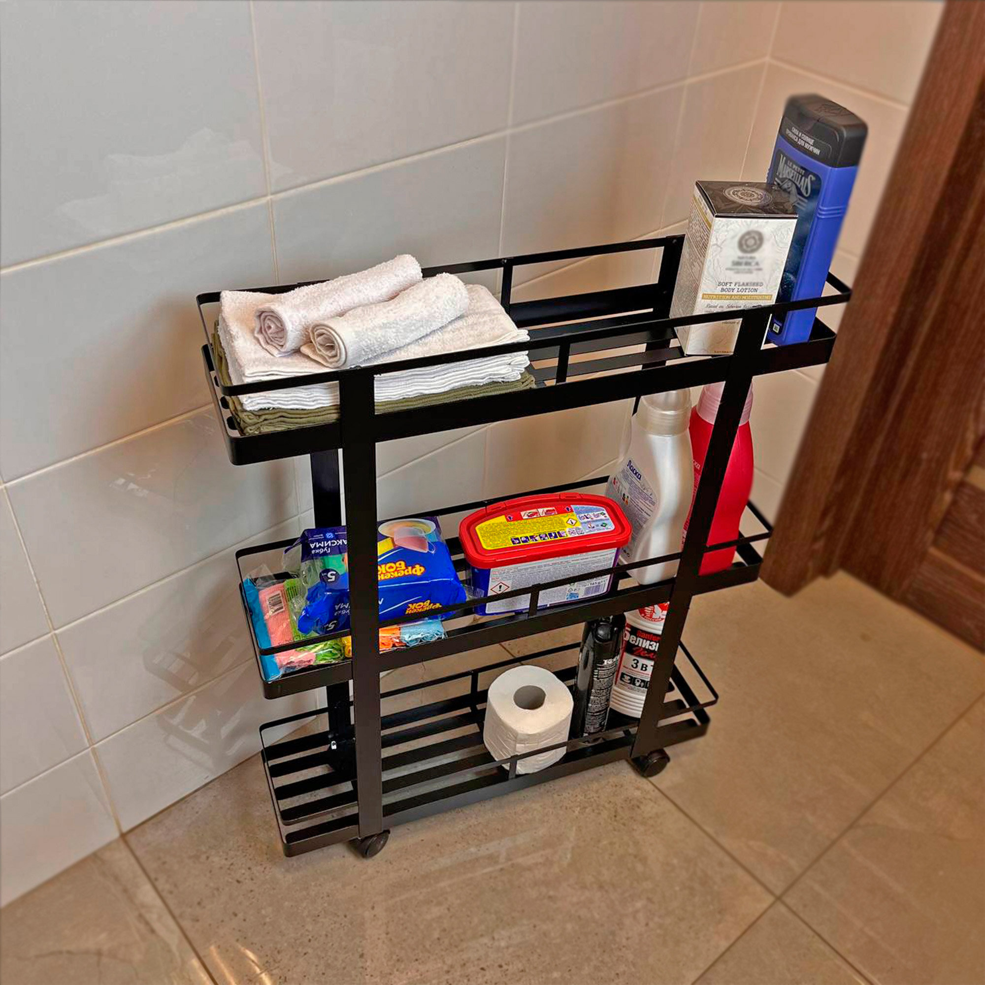 Этажерка для ванной, на колесиках, Mags, 60 х 15 х 75см, 3 полки, черный матовый интересное: