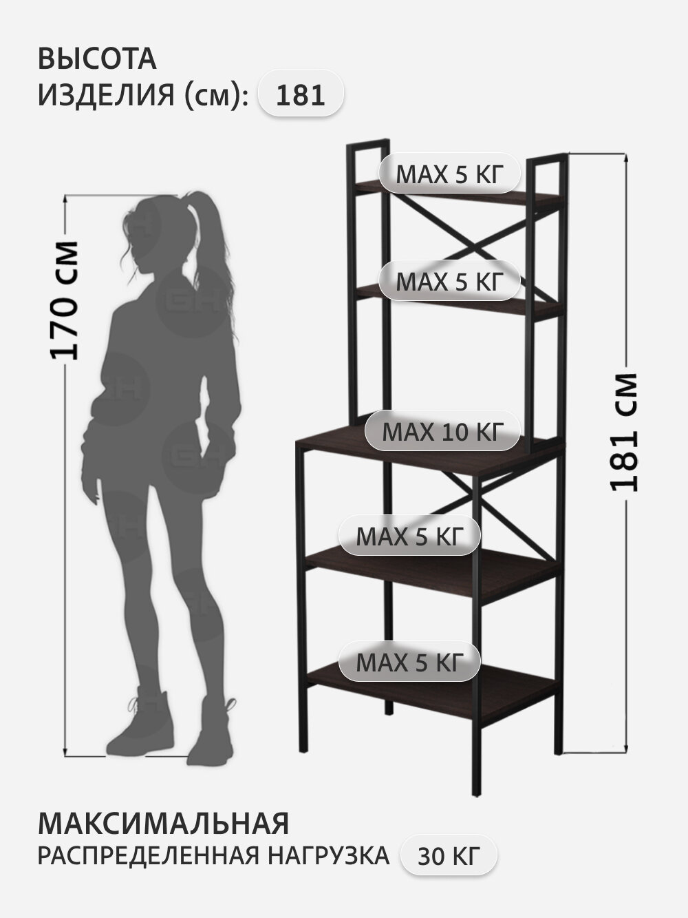 Стеллаж ГРОСТАТ KOKSET Loft, металлический, ЛДСП, открытый, 5 полок, 66 см x 45 см x 181 см