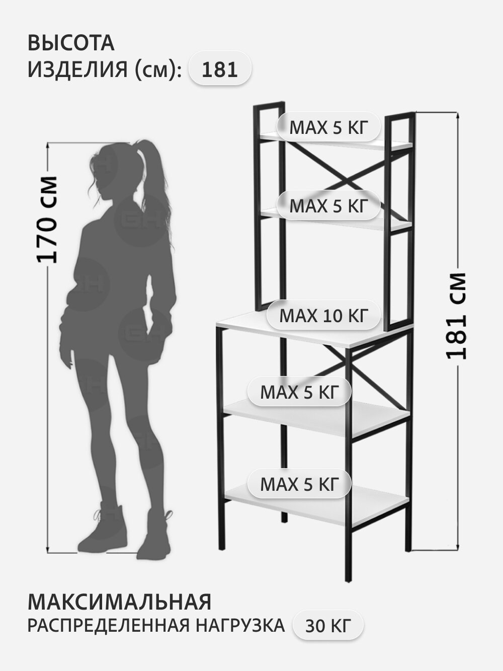 СохранитьСтеллаж KOKSET loft, высокий напольный металлический с 5 деревянными полками из ЛДСП, белый, 66х45х181 см, гростат интересное: