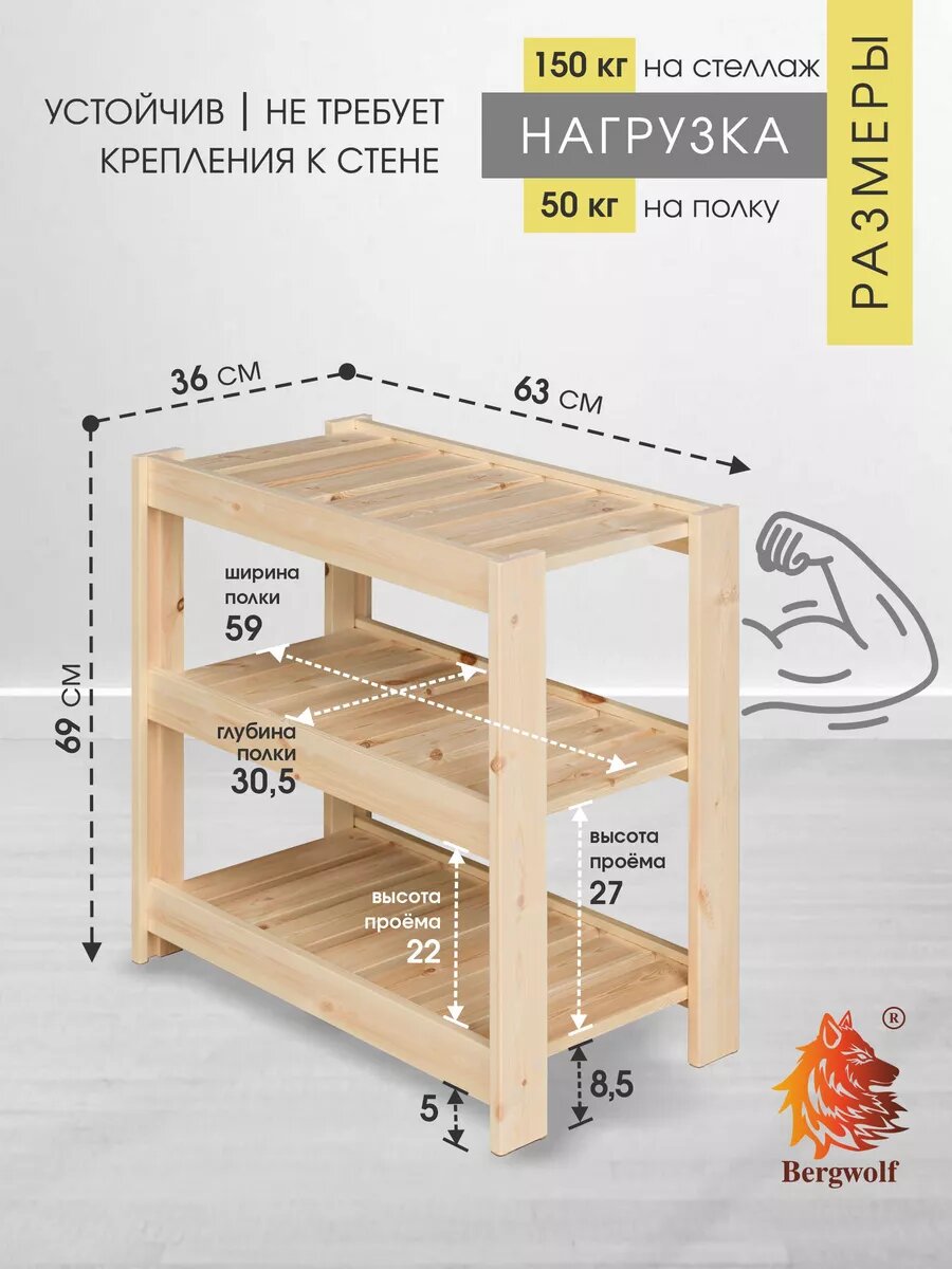 Стеллаж деревянный повышенной прочности 107*69*36 см, 3 полки