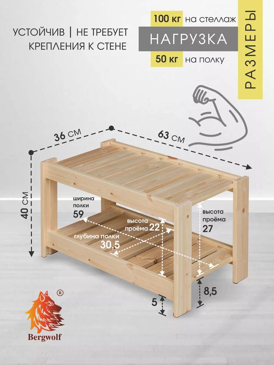 Стеллаж деревянный повышенной прочности 107*40*36 см, 2 полки