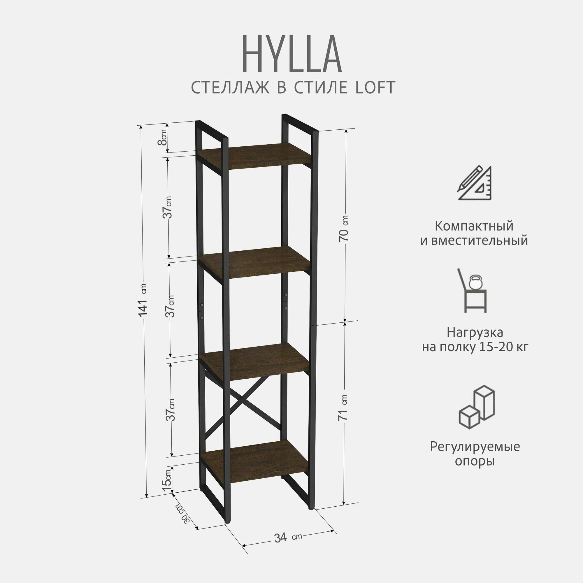 Стеллаж HYLLA LOFT, коричневый, напольный, модульный шкаф с 4 деревянными полками, 141х34х30 см, гростат