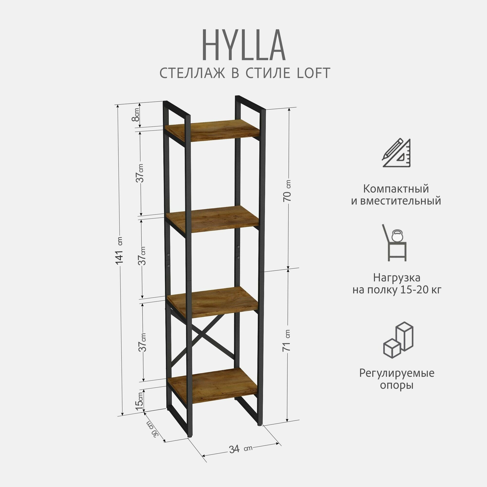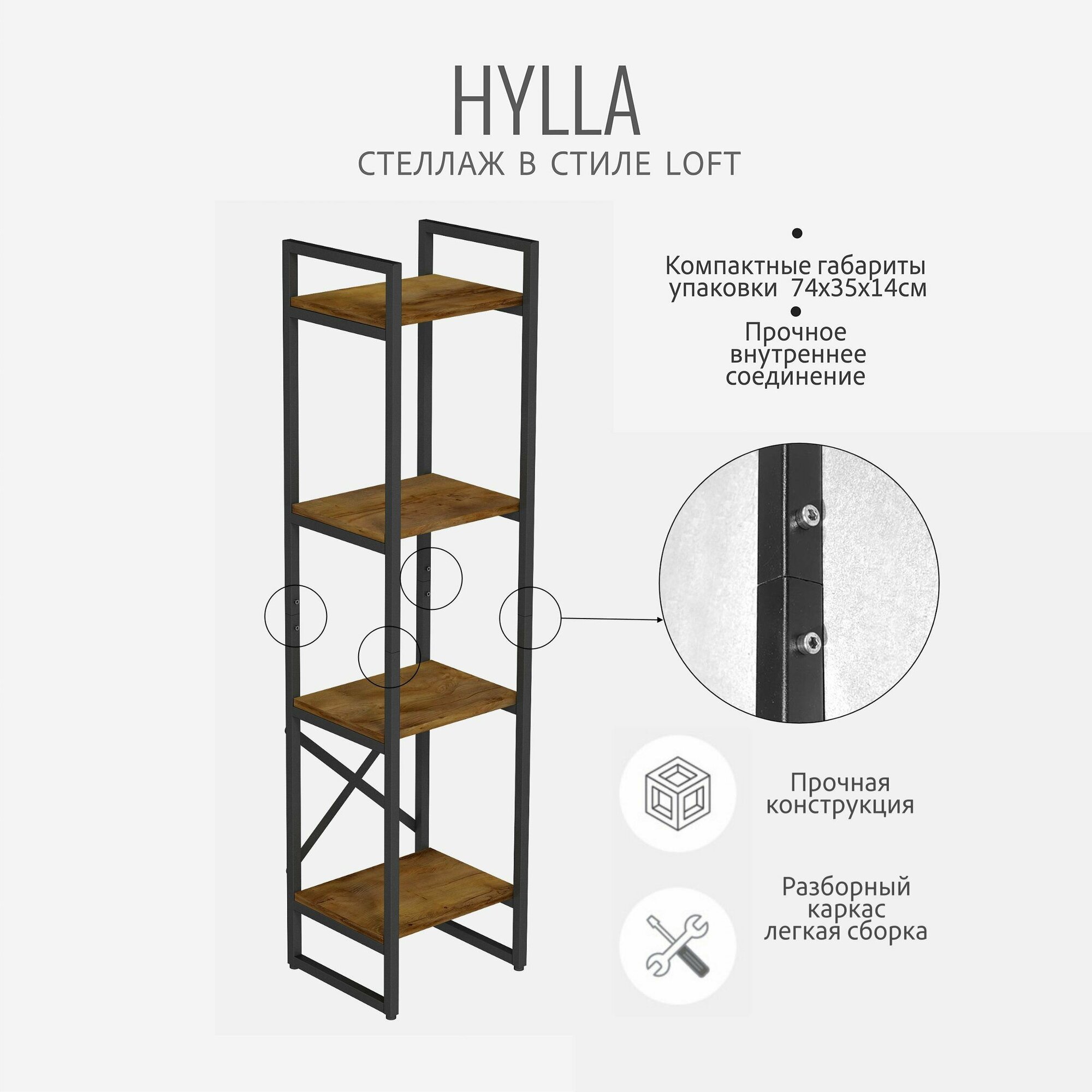 Стеллаж HYLLA LOFT, темно-коричневый, напольный, модульный шкаф с 4 деревянными полками, 141х34х30 см, гростат