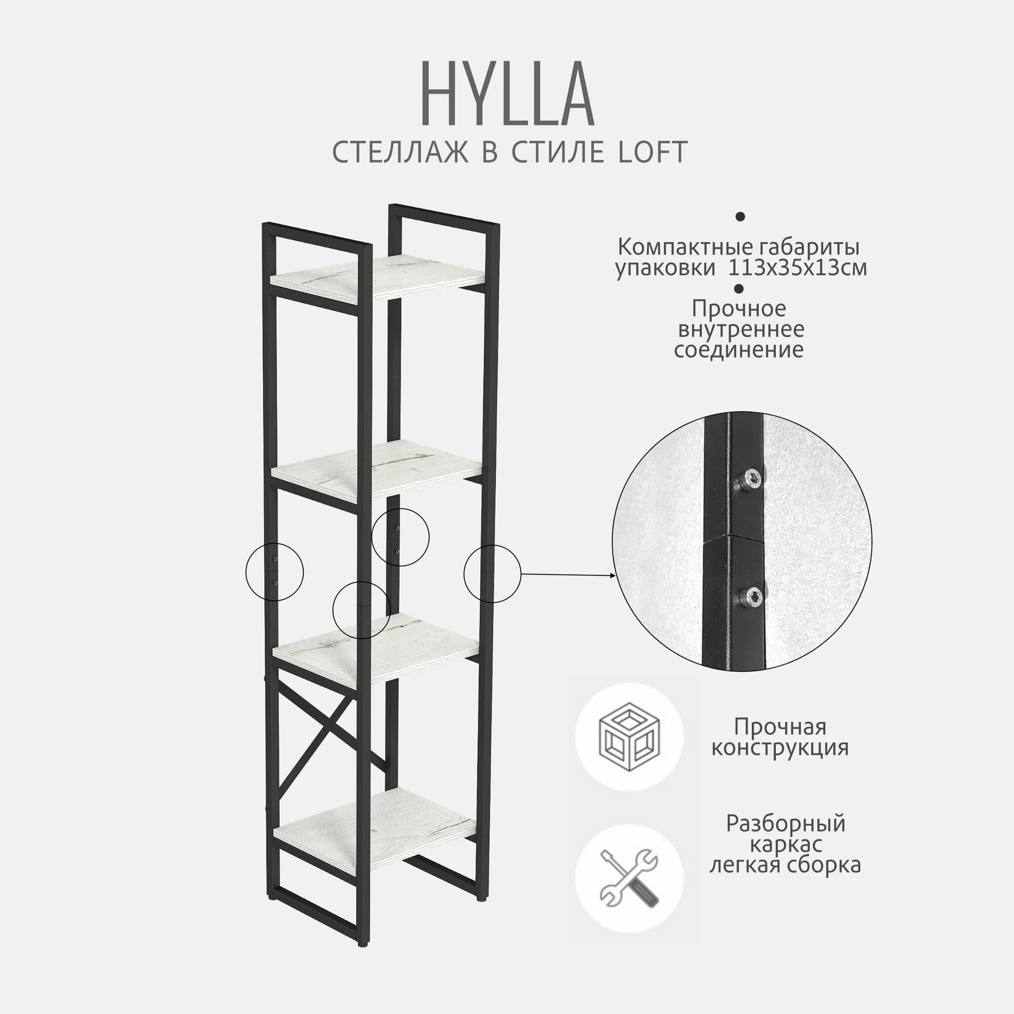 Стеллаж HYLLA LOFT, белый, напольный, модульный шкаф с 4 деревянными полками, 141х34х30 см, гростат