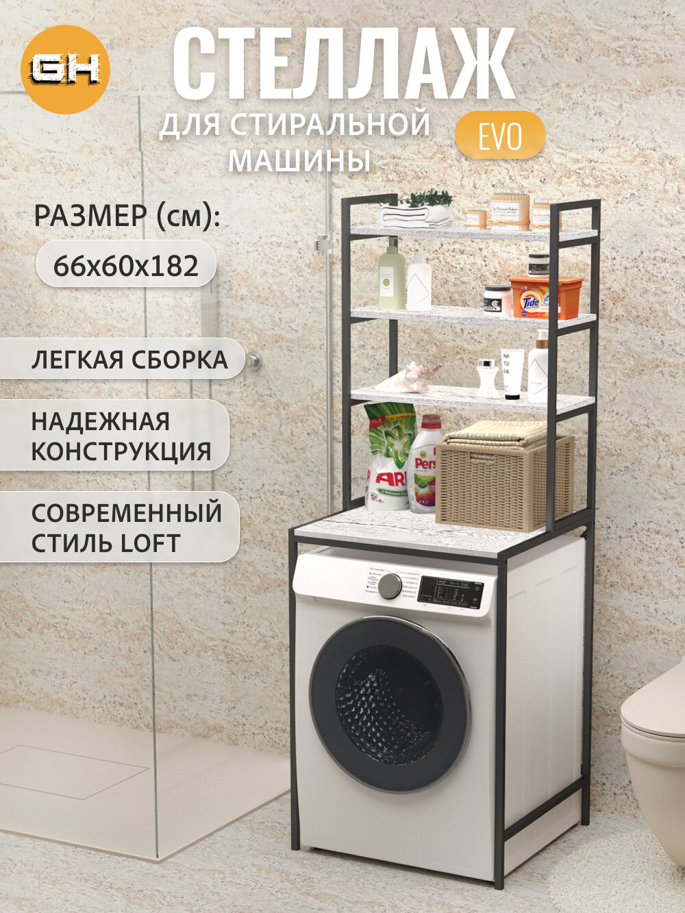 СохранитьСтеллаж в ванную EVO loft, светло-серый, этажерка для стиральной машины, шкаф для ванной комнаты, 66х60х182 см, гростат интересное: