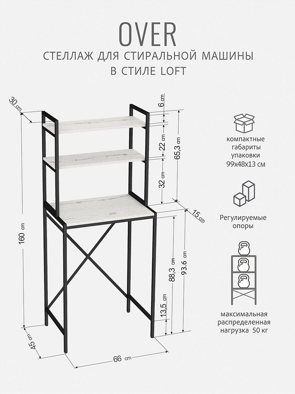 Стеллаж в ванную OVER loft, белый, этажерка для стиральной машины, шкаф для ванной комнаты, 66х45х160 см, гростат