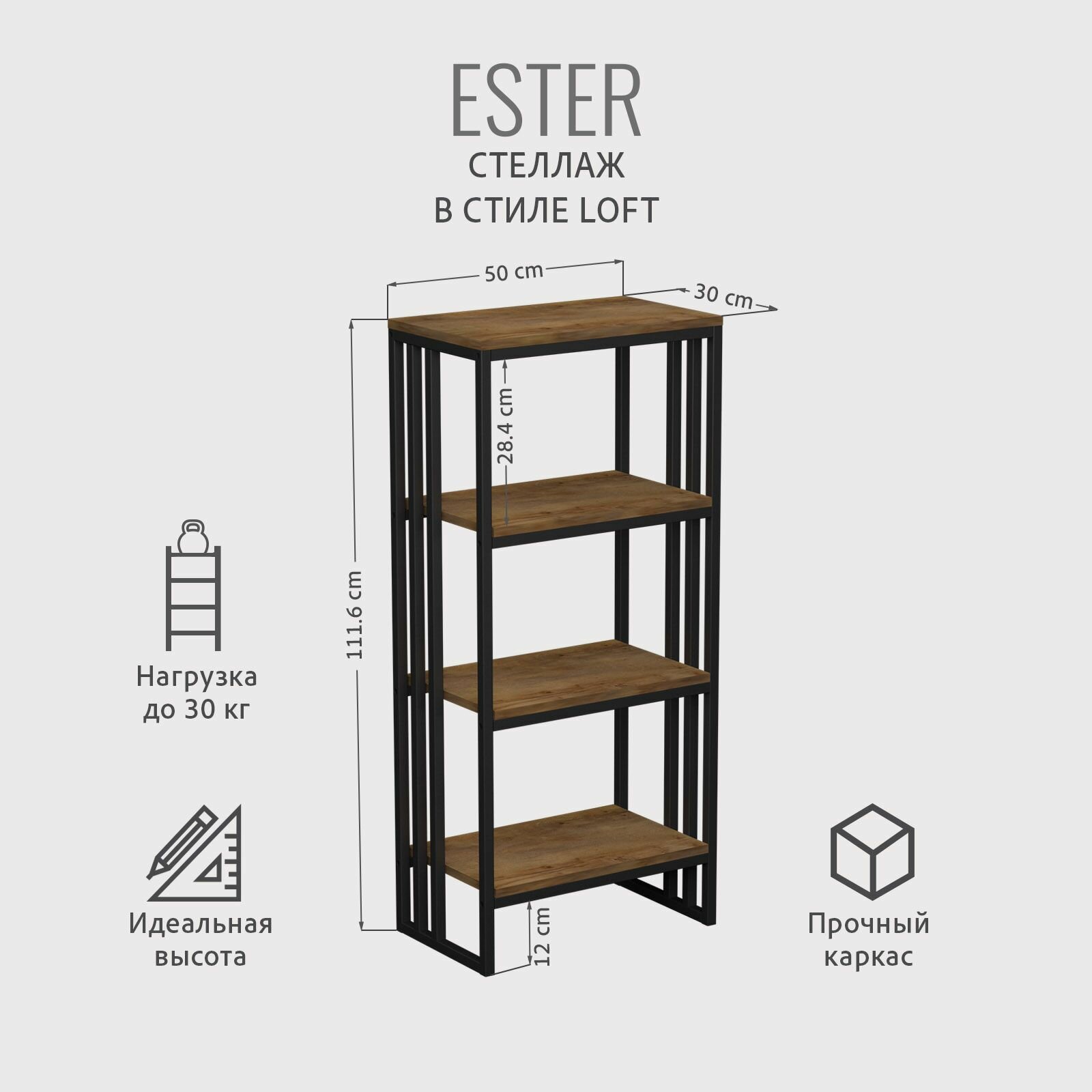 Стеллаж ESTER, темно-коричневый, напольный металлический с 4-мя полками в стиле лофт, 50х30х111.6 см, гростат