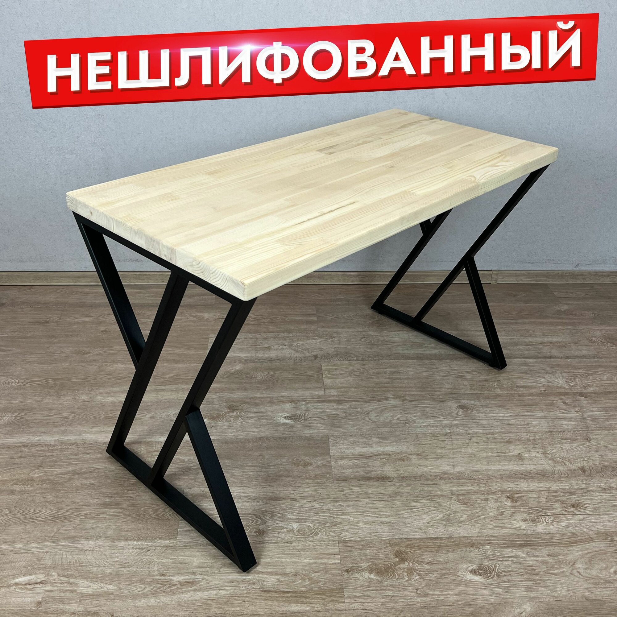 Стол кухонный Loft со столешницей из массива сосны 40 мм без шлифовки и покрытия, с черными металлическими Z-образными ножками, 140х80х75 см