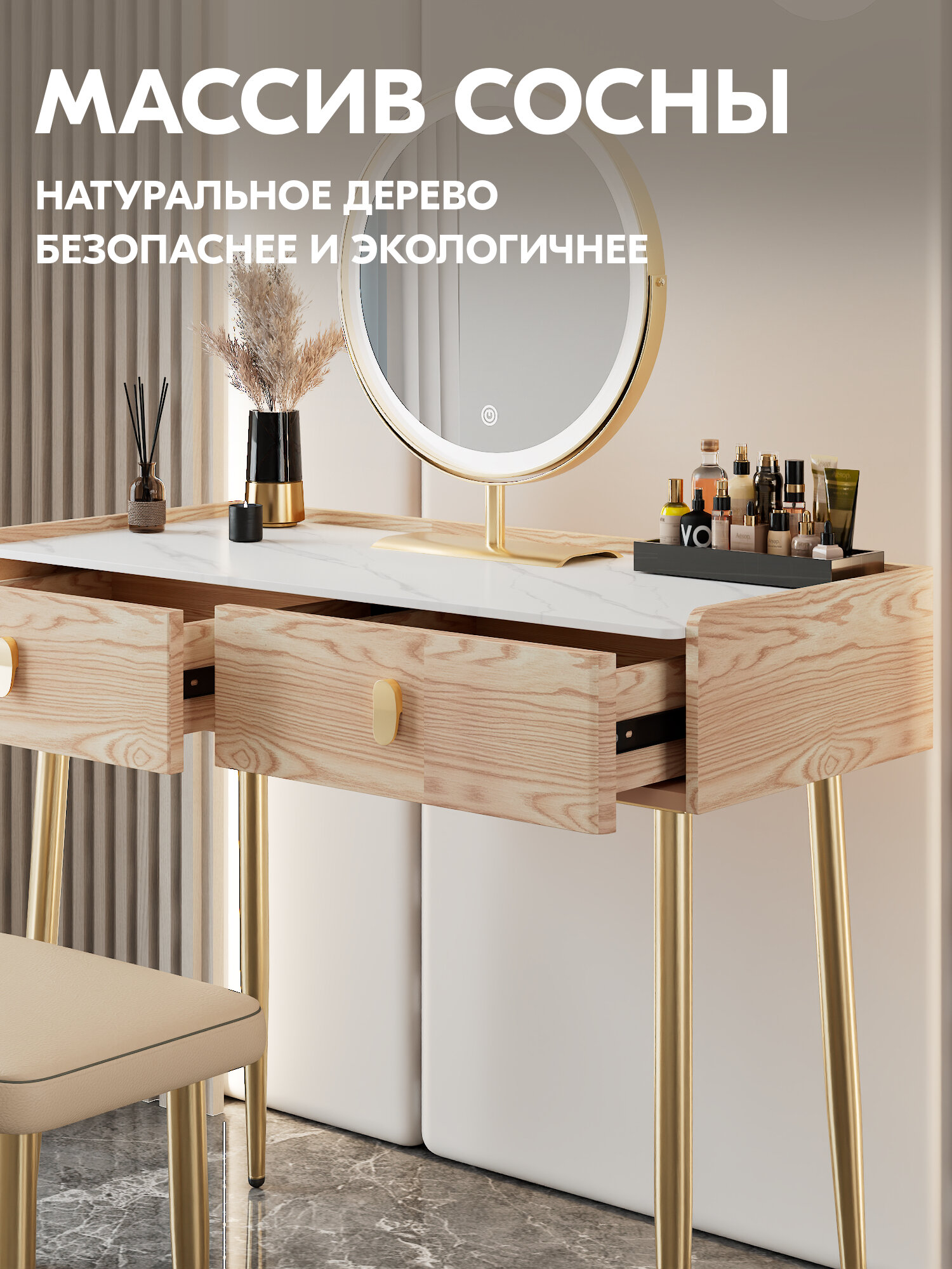 Купить Комплект туалетный столик, LED зеркало и пуфиком 80x40x127 см, стекло, каркас из дерева, обтянут кожей, Шампань золотой