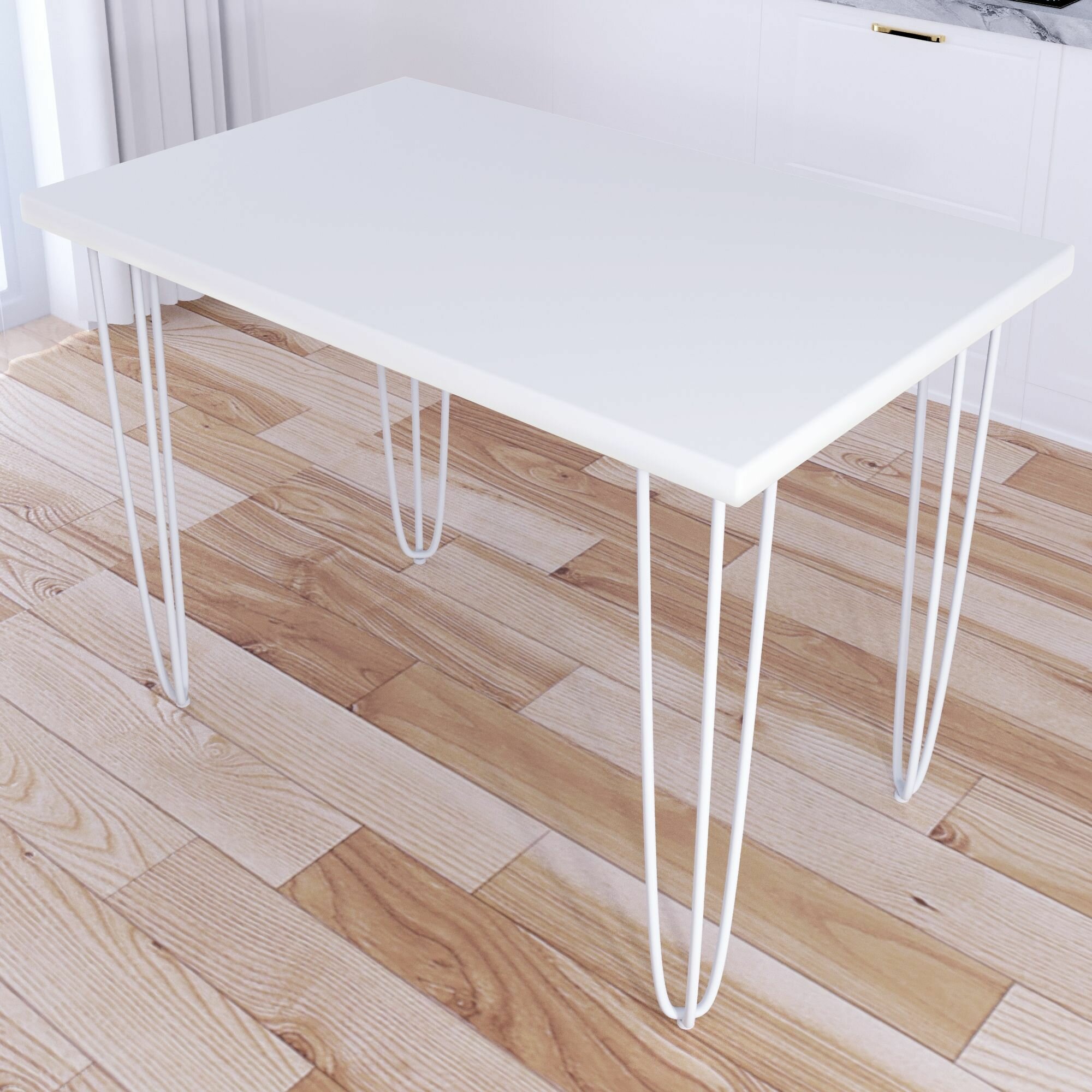 Купить Стол кухонный Loft со столешницей белого цвета из массива сосны 40 мм на белых металлических ножках-шпильках, 110x60х75 см