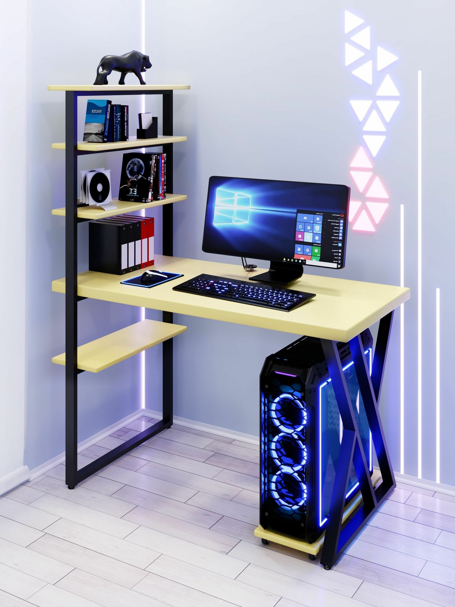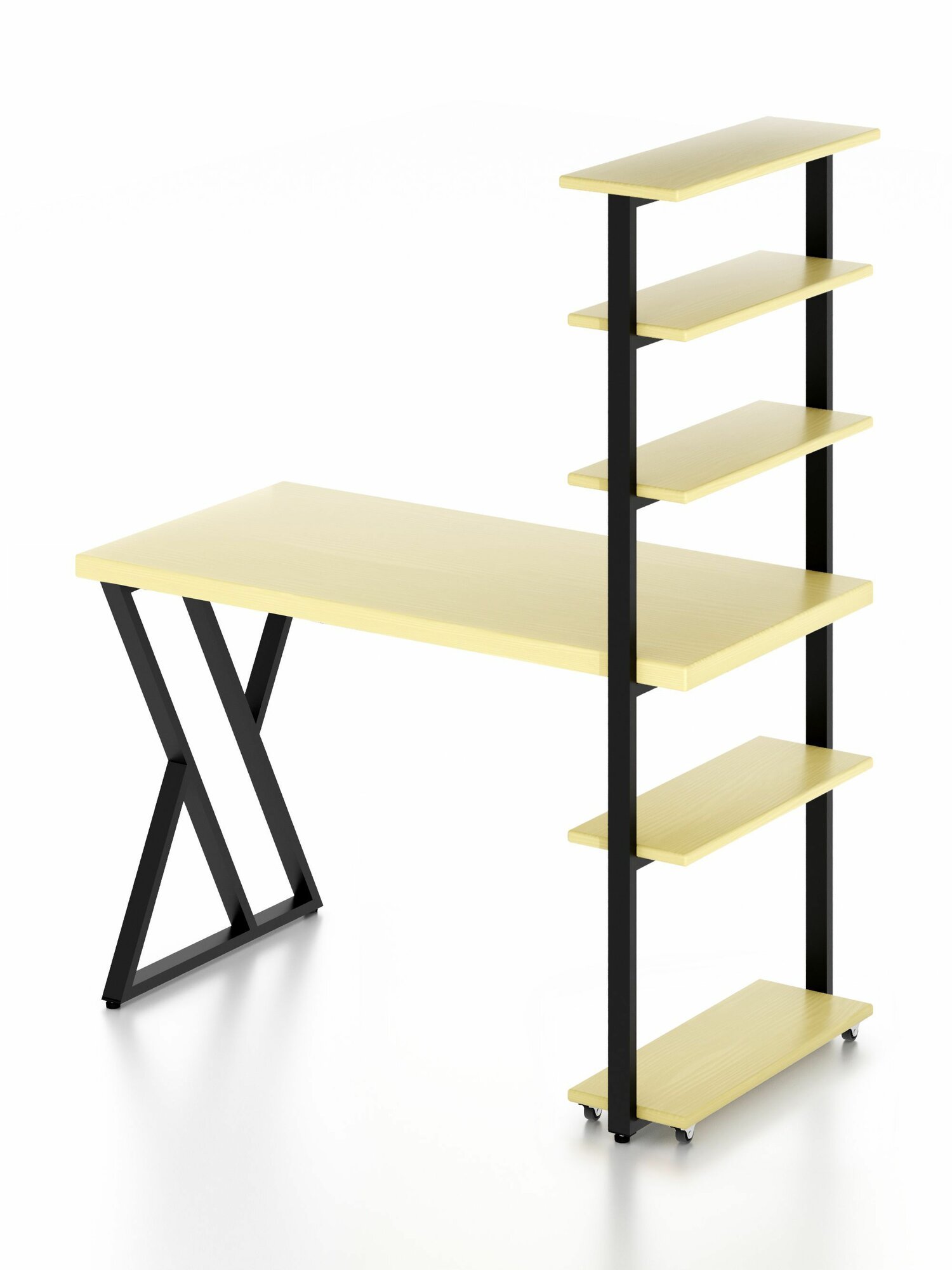 Стол компьютерный Loft с пятью полками, столешница цвета ванили из массива сосны 40 мм и черные металлические Z-образные ножки, 100х80х148 см