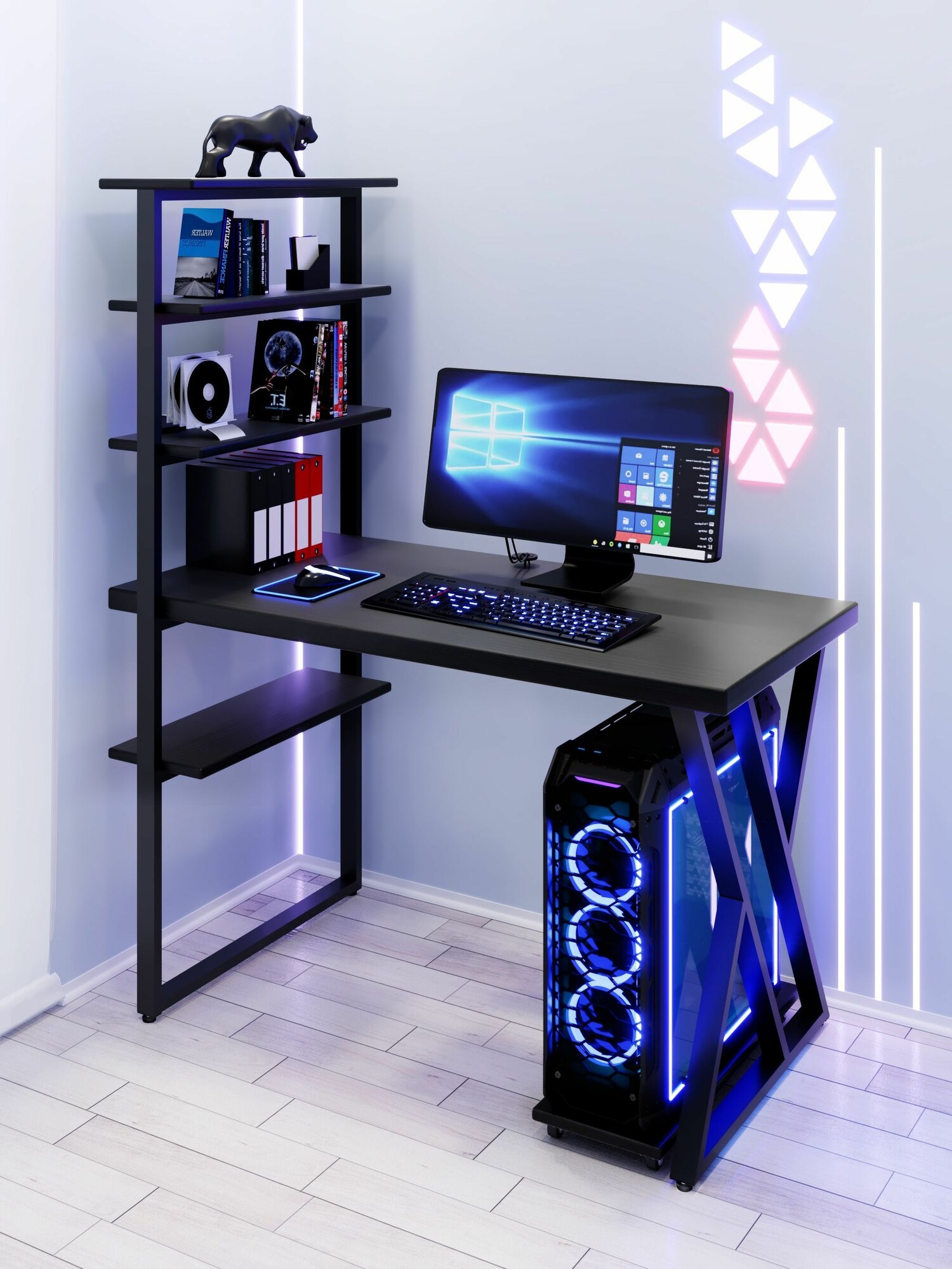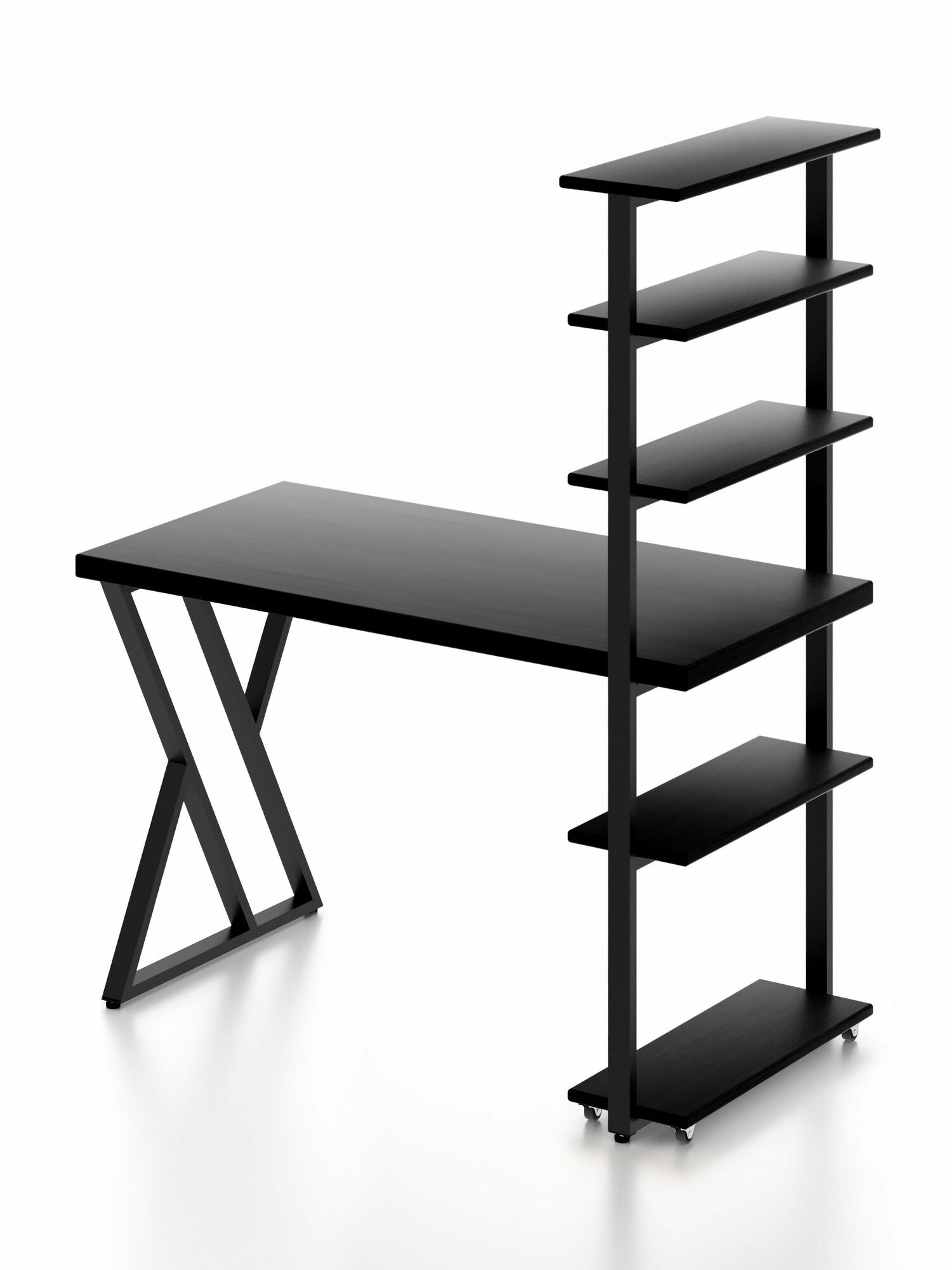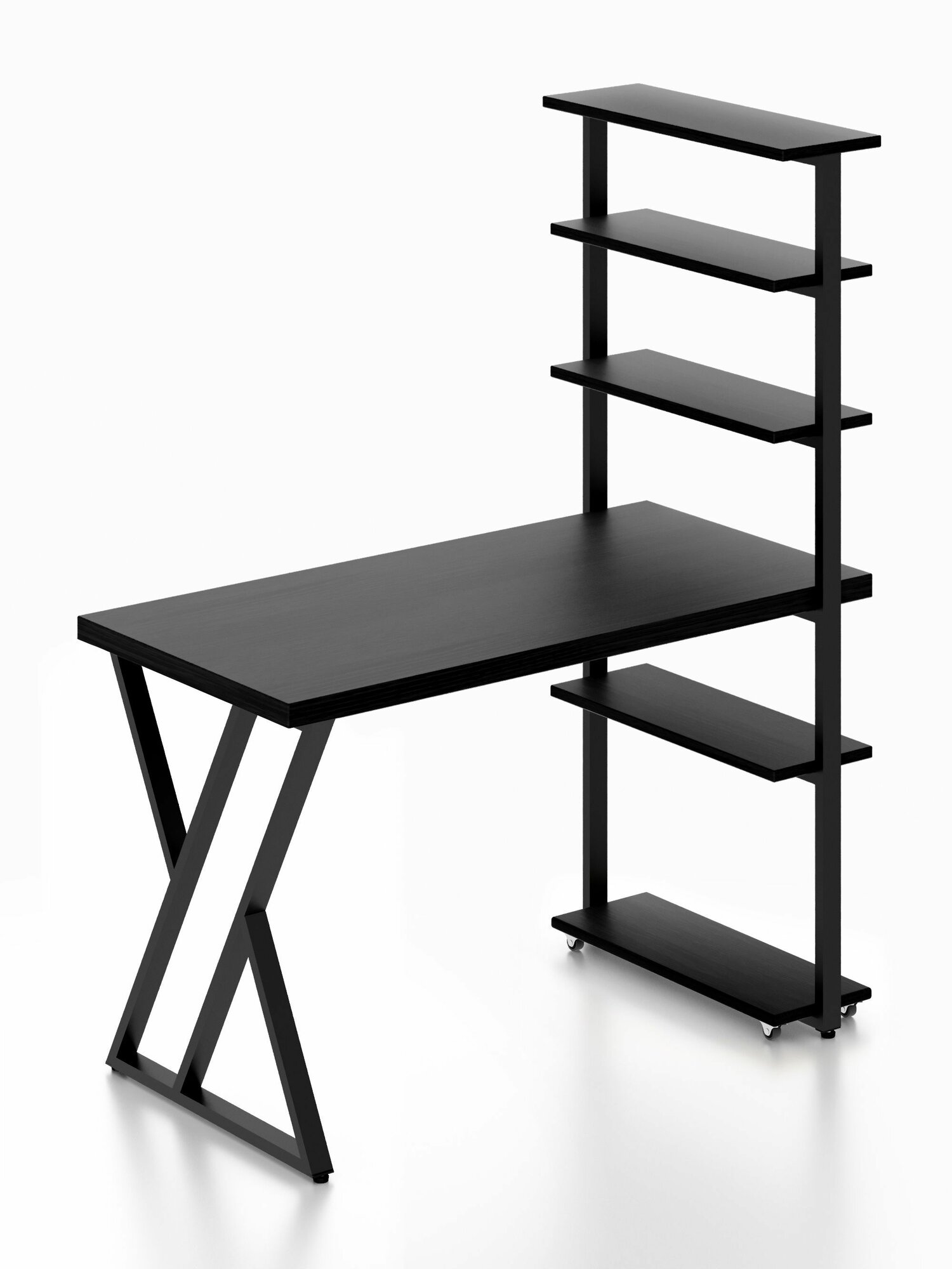 Стол компьютерный Loft с пятью полками, столешница цвета черного оникса из массива сосны 40 мм и черные металлические Z-образные ножки, 100х60х148 см