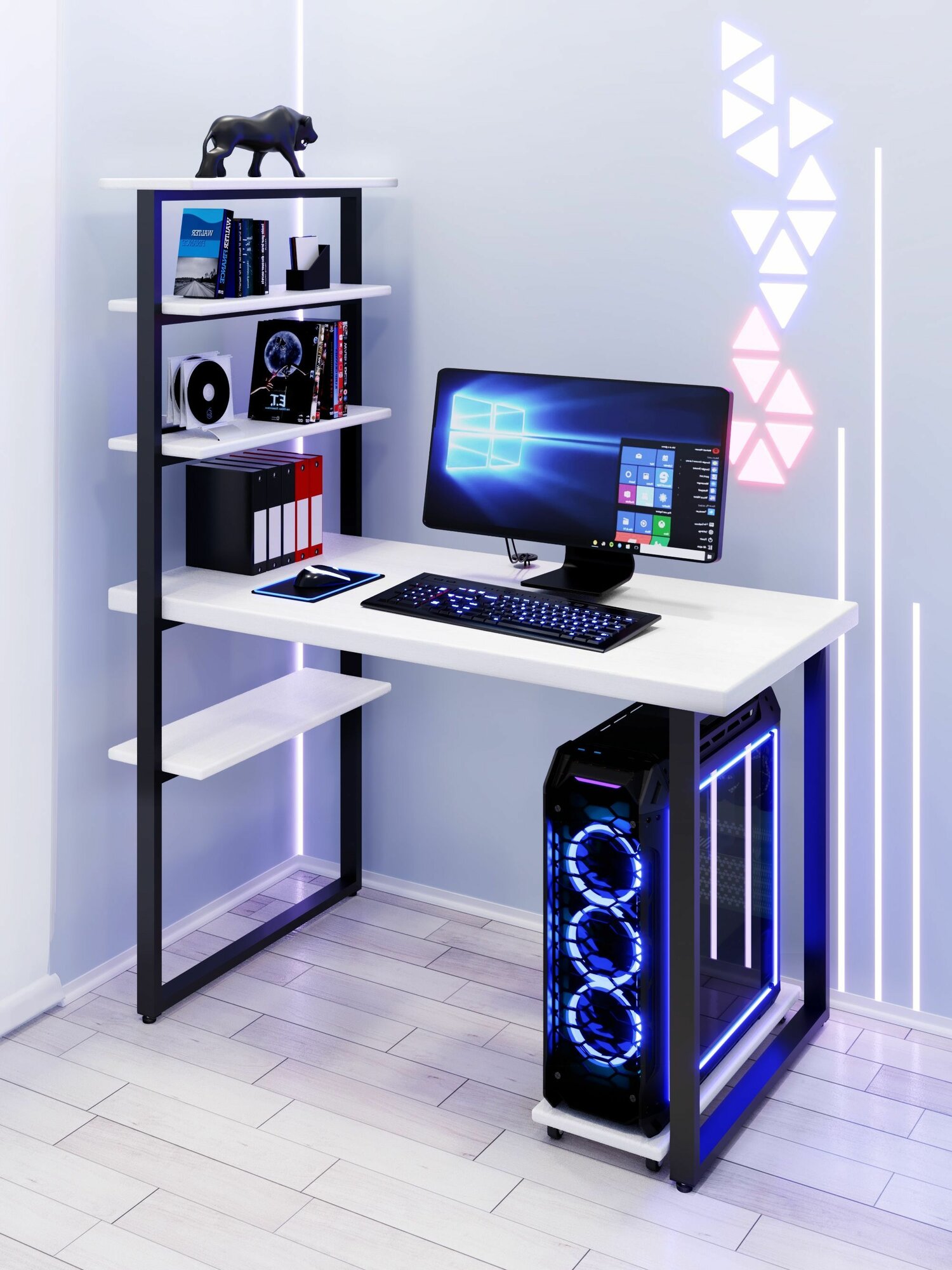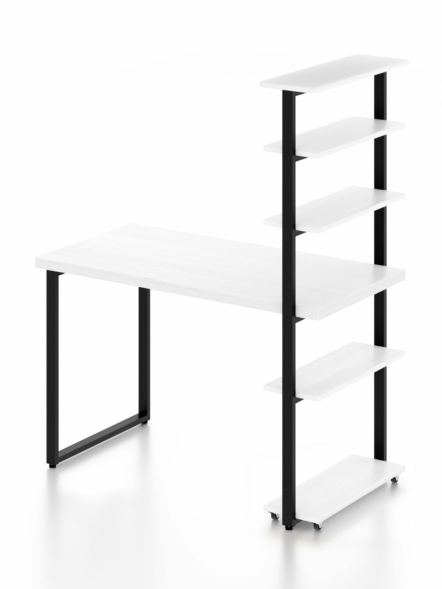 Стол компьютерный Loft с пятью полками, столешница белого цвета из массива сосны 40 мм и черные металлические ножки, 100х80х148 см