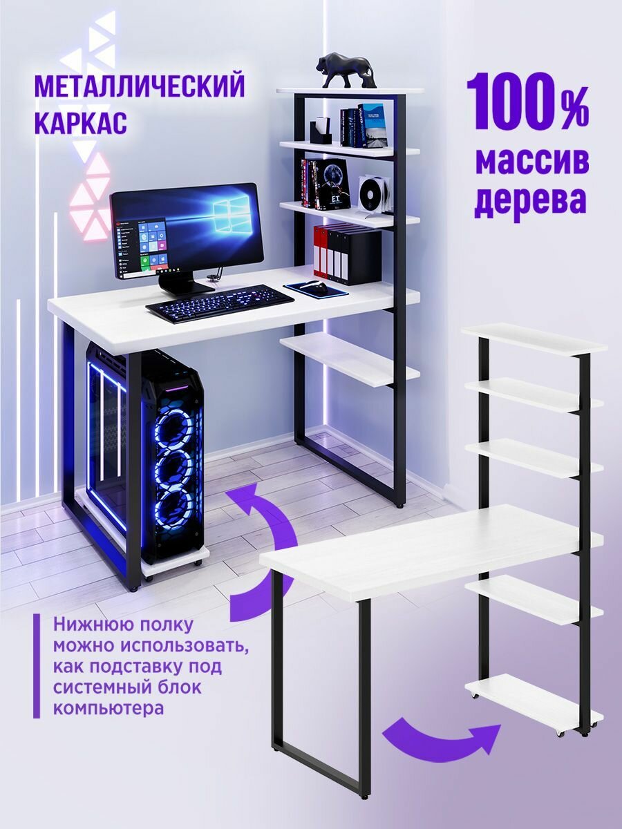 Стол компьютерный Loft с пятью полками, столешница белого цвета из массива сосны 40 мм и черные металлические ножки, 110х60х148 см