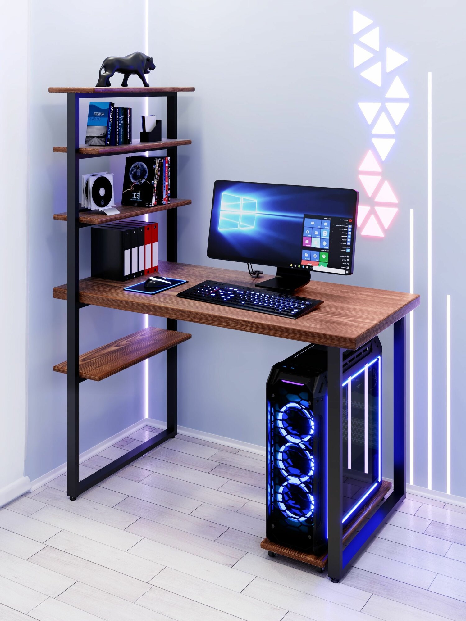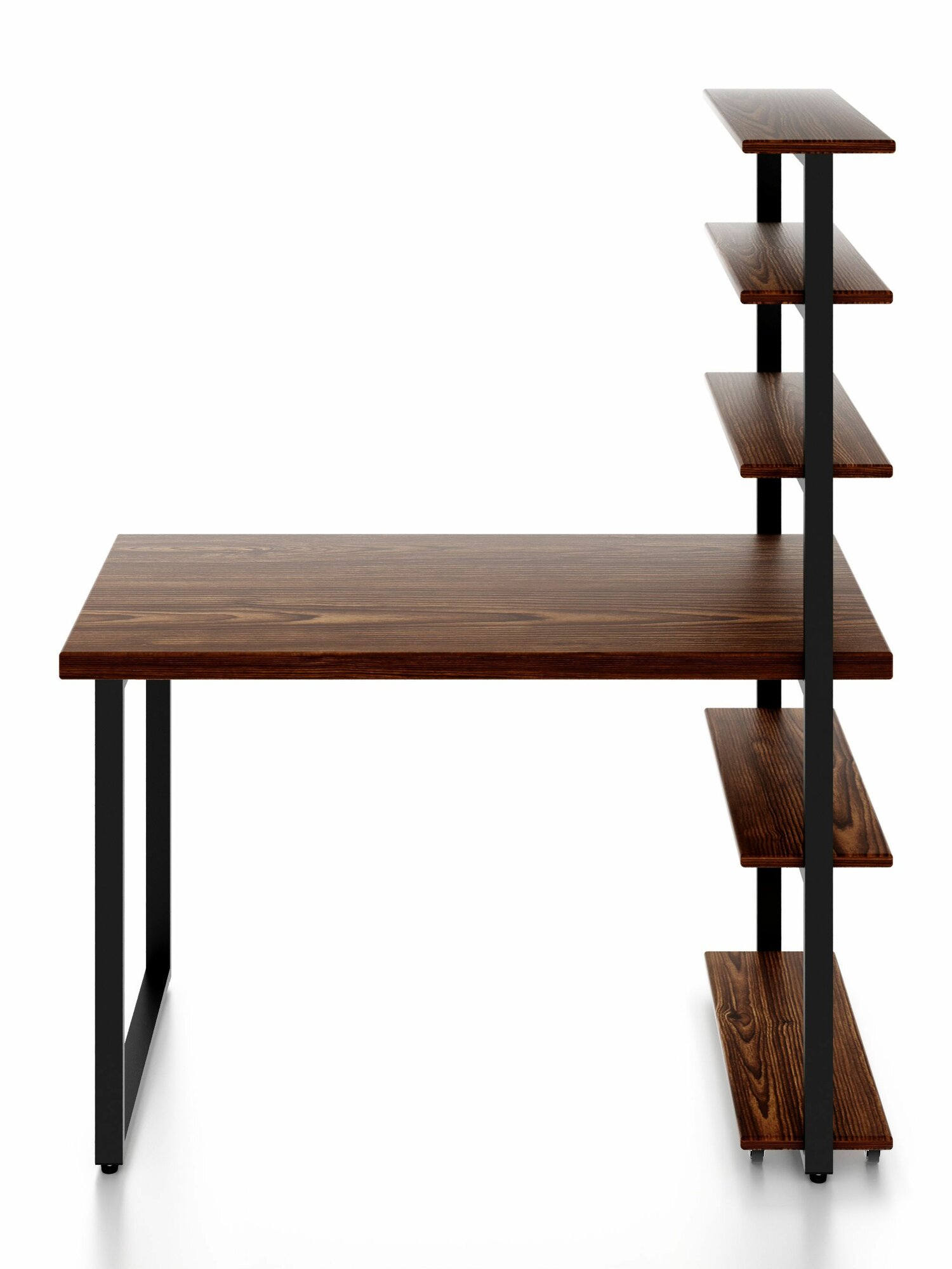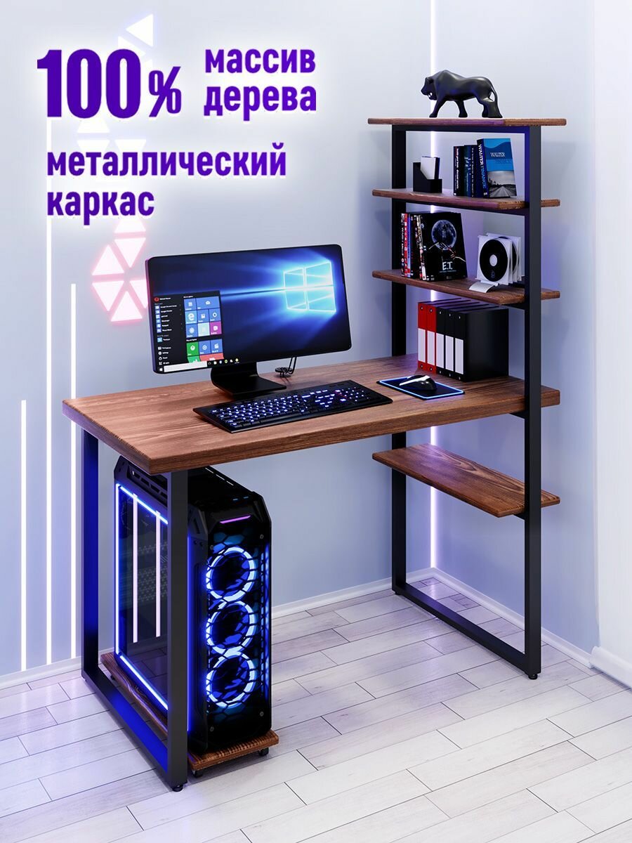 Стол компьютерный Loft с пятью полками, столешница цвета темного дуба из массива сосны 40 мм и черные металлические ножки, 120х80х148 см
