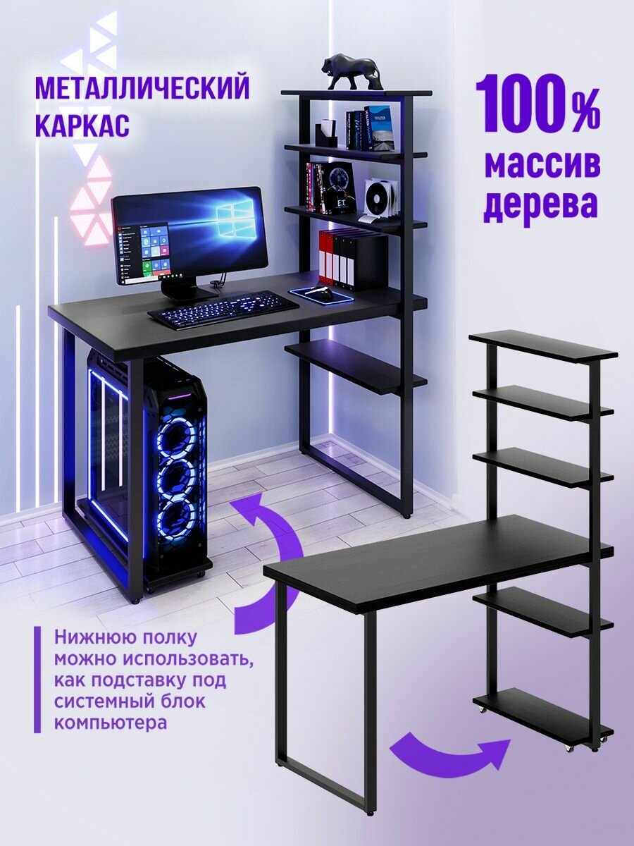 Стол компьютерный Loft с пятью полками, столешница цвета черного оникса из массива сосны 40 мм и черные металлические ножки, 110х80х148 см