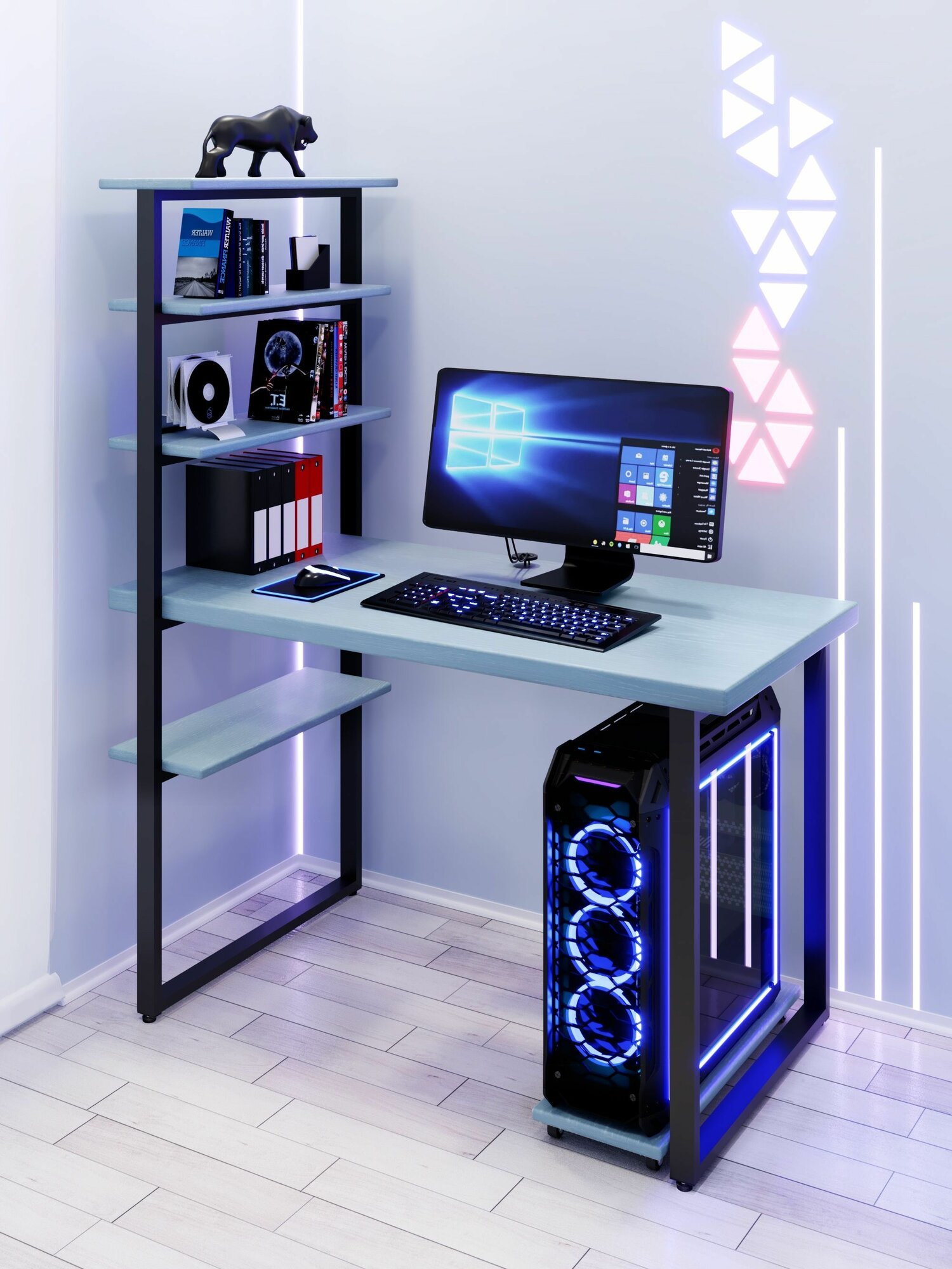 Стол компьютерный Loft с пятью полками, столешница голубого цвета из массива сосны 40 мм и черные металлические ножки, 100х60х148 см