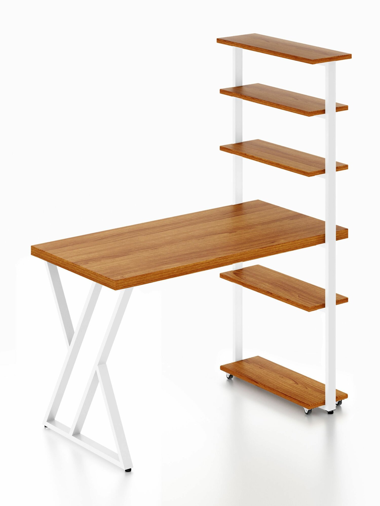 Стол компьютерный Loft с пятью полками, столешница цвета темного дуба из массива сосны 40 мм и белые металлические Z-образные ножки, 110х80х148 см