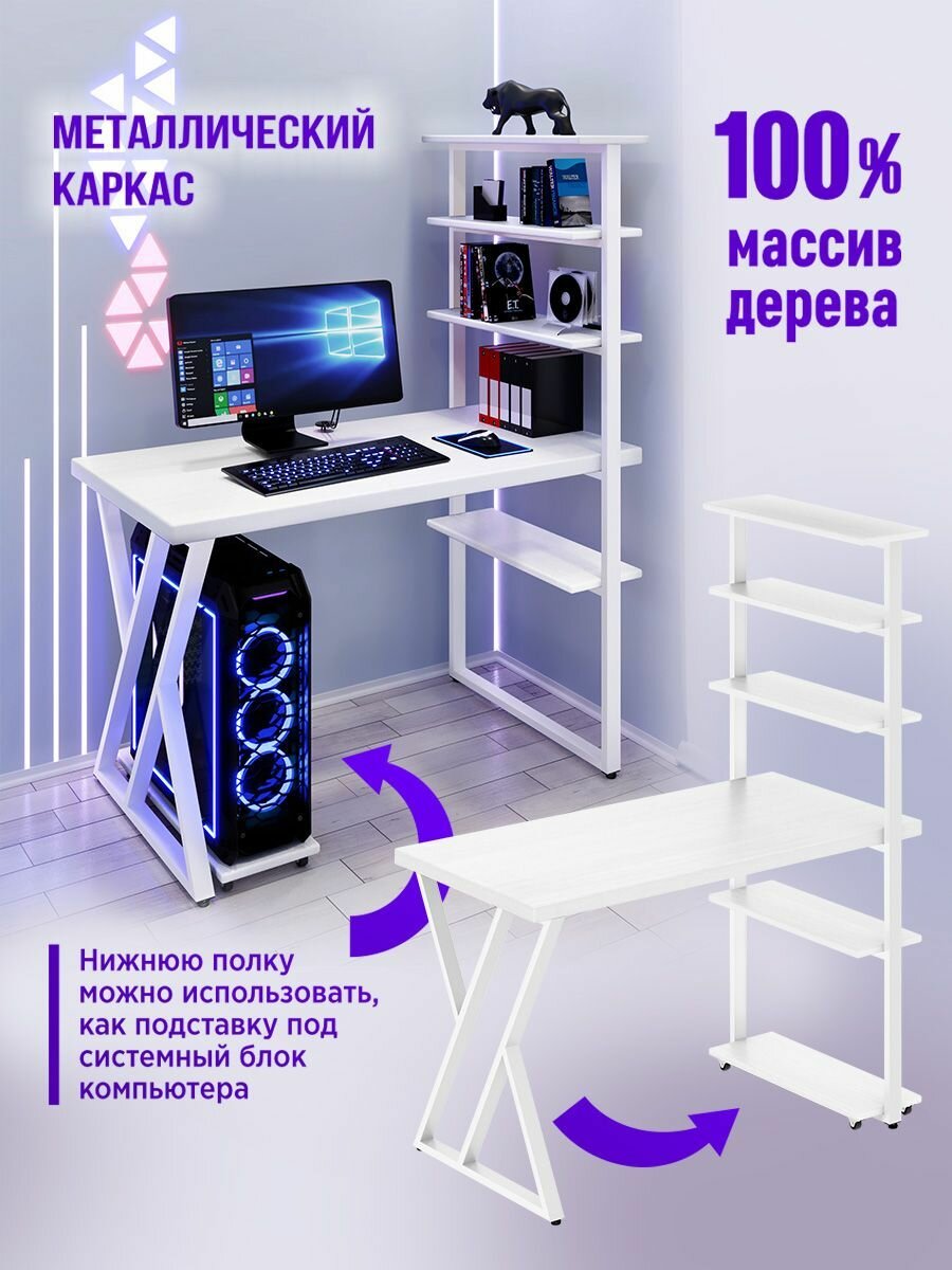 Стол компьютерный Loft с пятью полками, столешница белого цвета из массива сосны 40 мм и белые металлические Z-образные ножки, 120х80х148 см