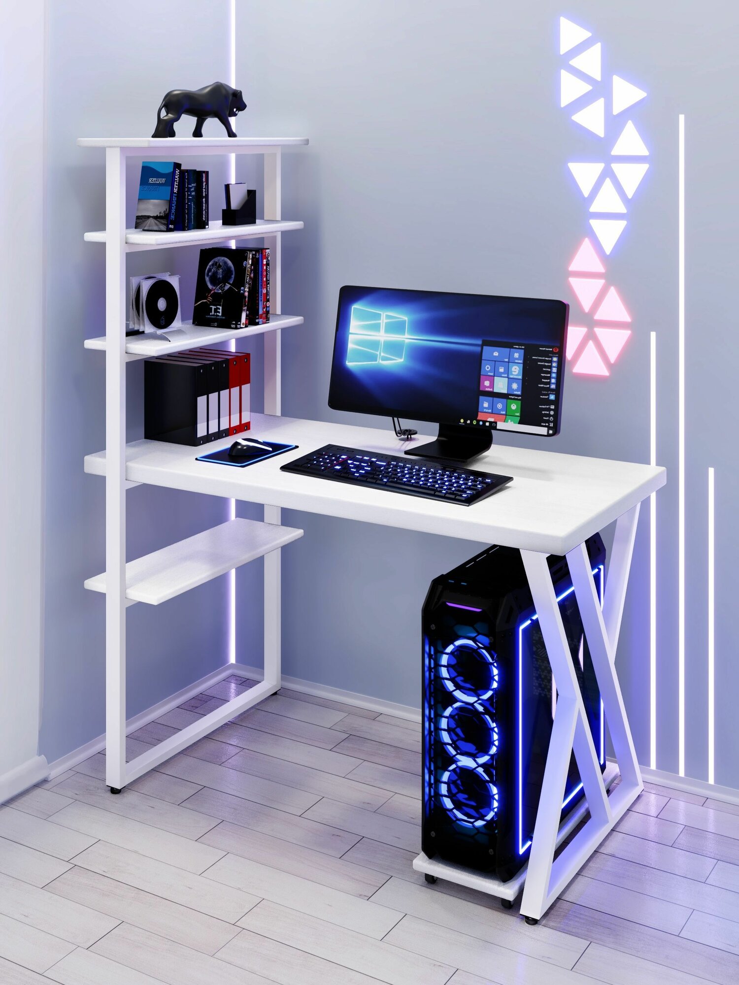 Стол компьютерный Loft с пятью полками, столешница голубого цвета из массива сосны 40 мм и белые металлические Z-образные ножки, 90х60х148 см