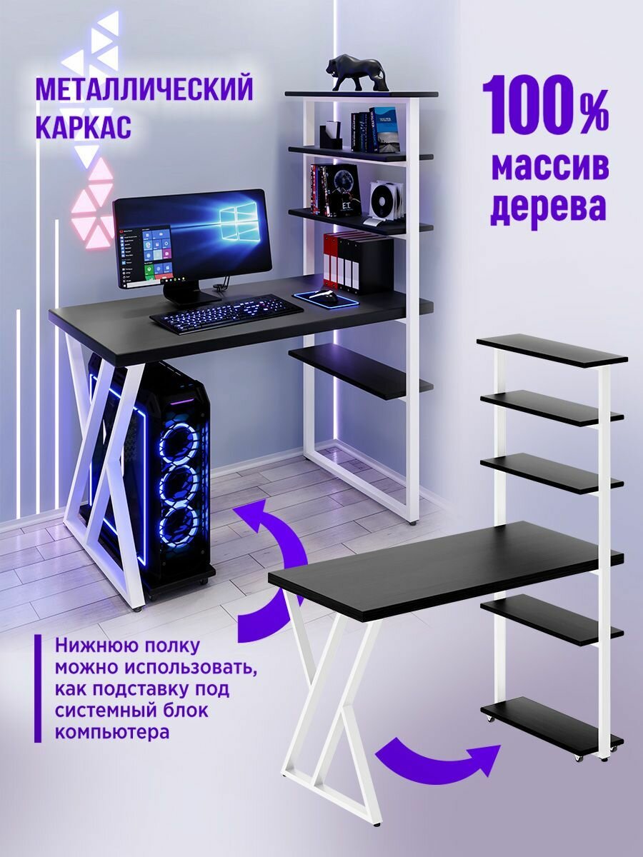 Стол компьютерный Loft с пятью полками, столешница цвета черного оникса из массива сосны 40 мм и белые металлические Z-образные ножки, 100х60х148 см