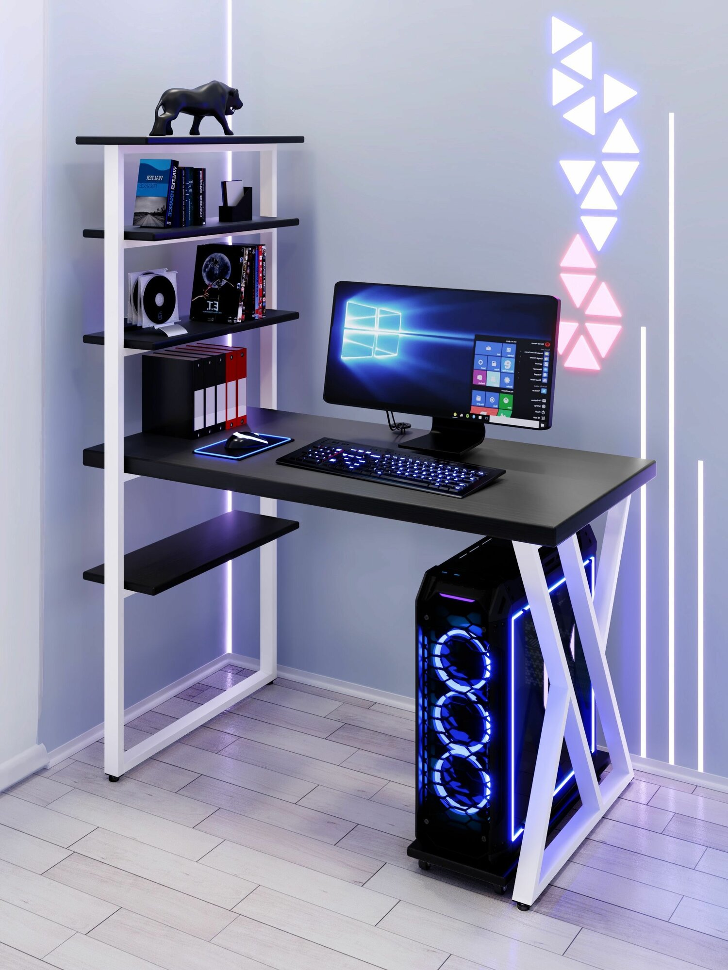 Стол компьютерный Loft с пятью полками, столешница цвета черного оникса из массива сосны 40 мм и белые металлические Z-образные ножки, 90х60х148 см