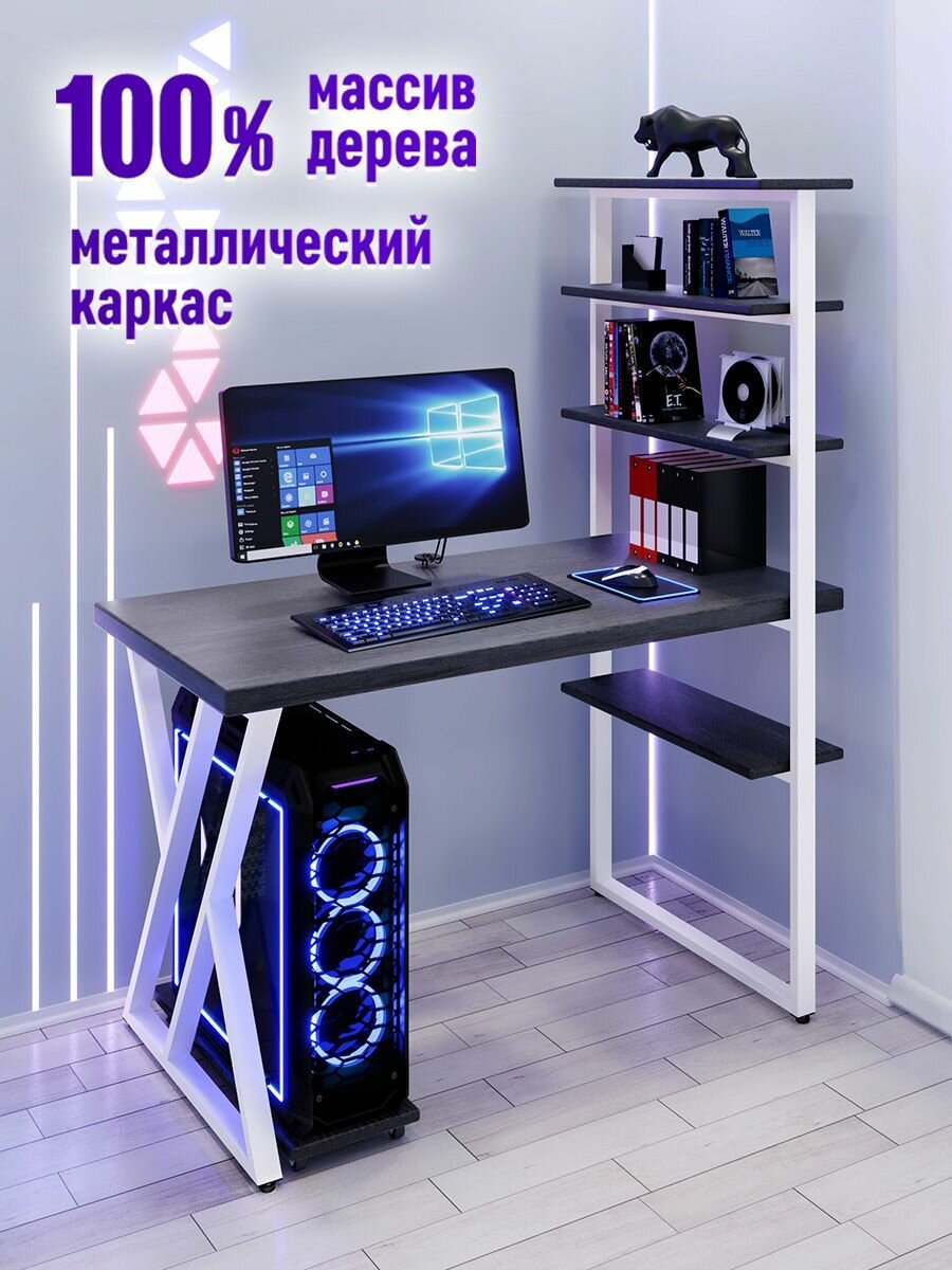 Стол компьютерный Loft с пятью полками, столешница цвета черного оникса из массива сосны 40 мм и белые металлические Z-образные ножки, 110х60х148 см