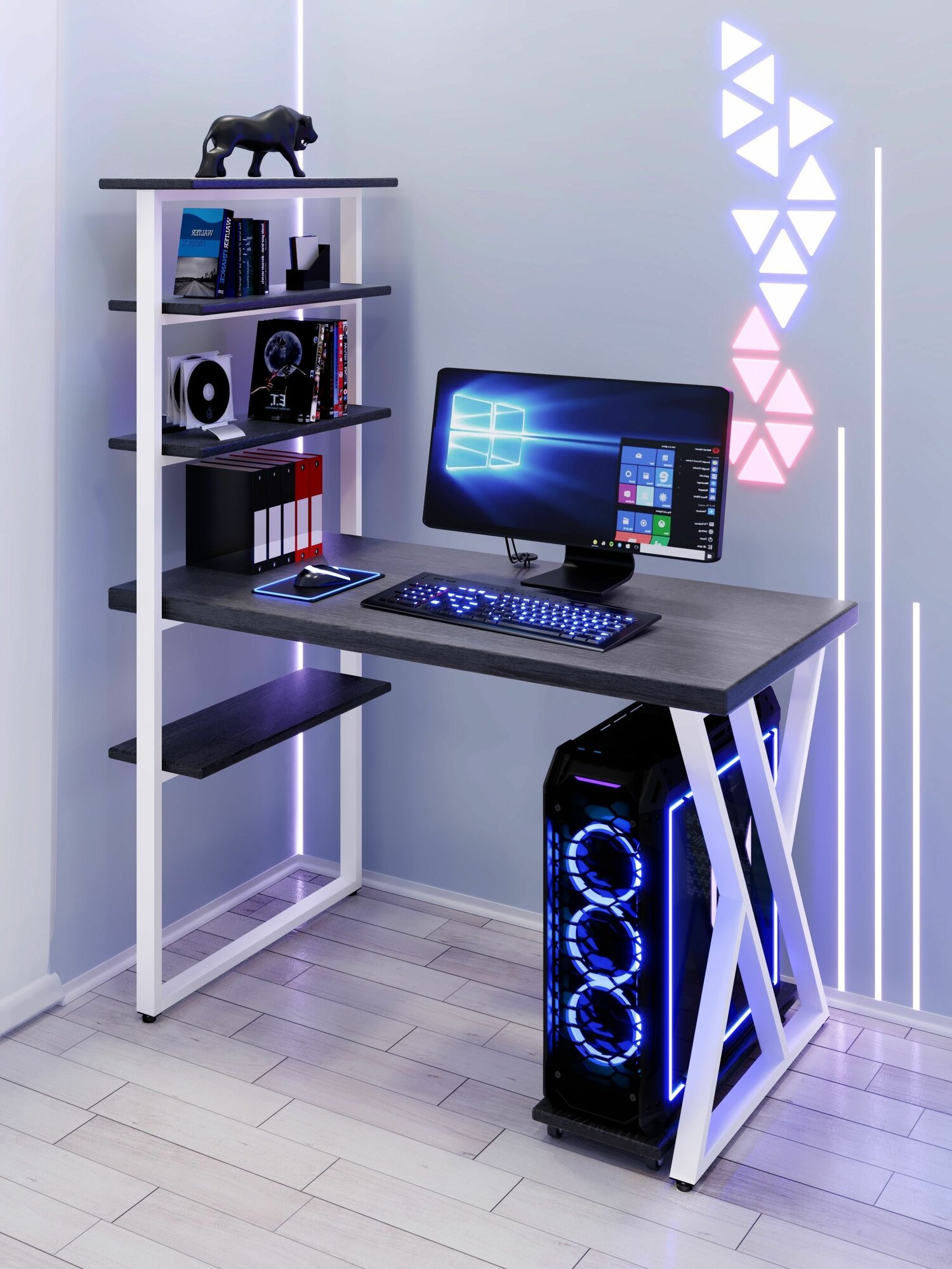 Стол компьютерный Loft с пятью полками, столешница цвета антрацит из массива сосны 40 мм и белые металлические Z-образные ножки, 110х60х148 см
