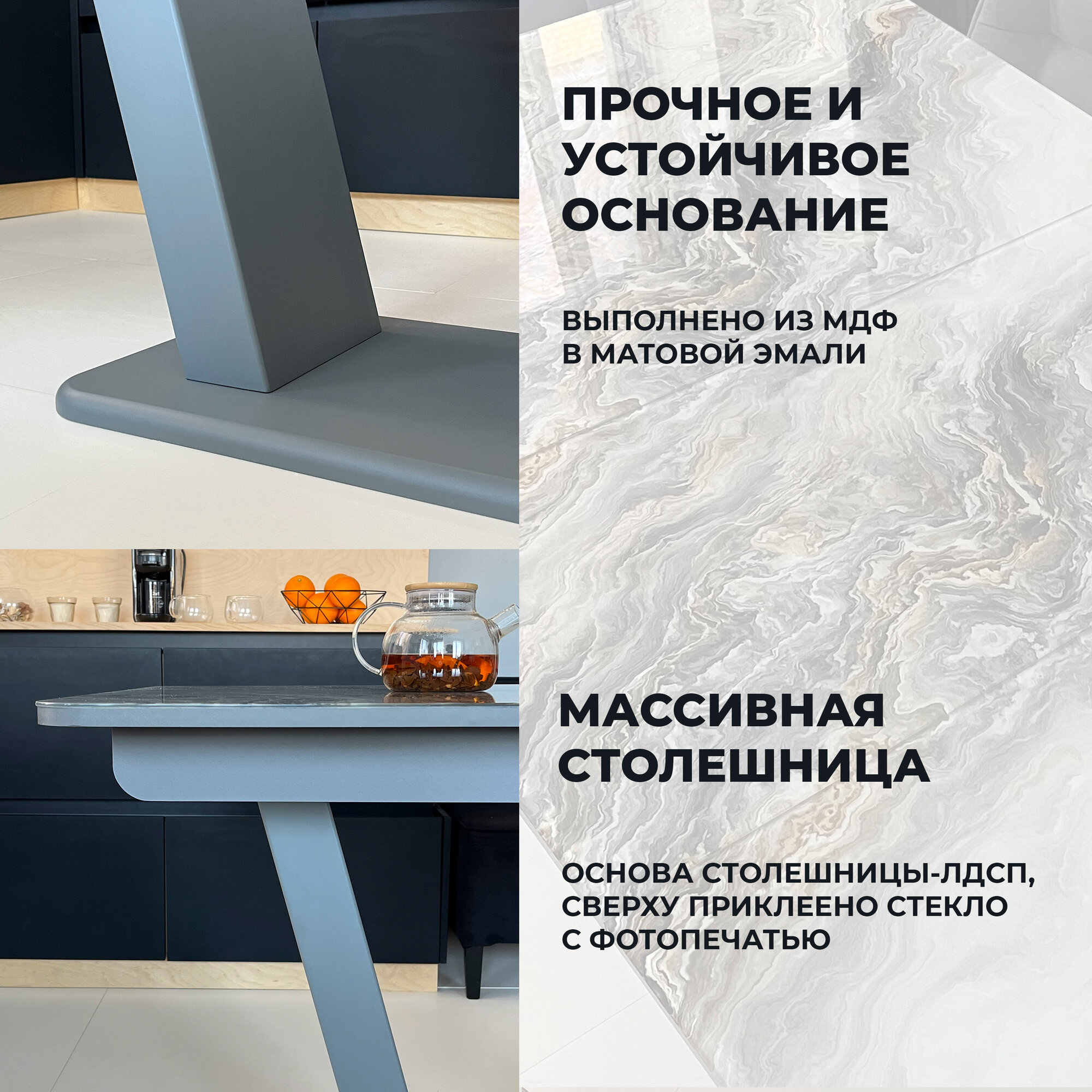 Стол обеденный Денвер раздвижной, 120 х 80 х 75 мрамор Серый с графитовыми опорами