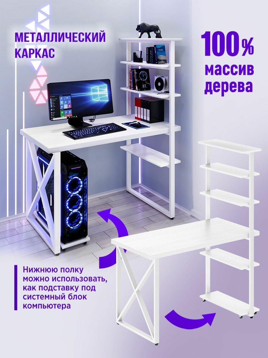 Стол компьютерный Loft с пятью полками, лакированная столешница из массива сосны 40 мм и белые металлические крестообразные ножки, 110х60х148 см