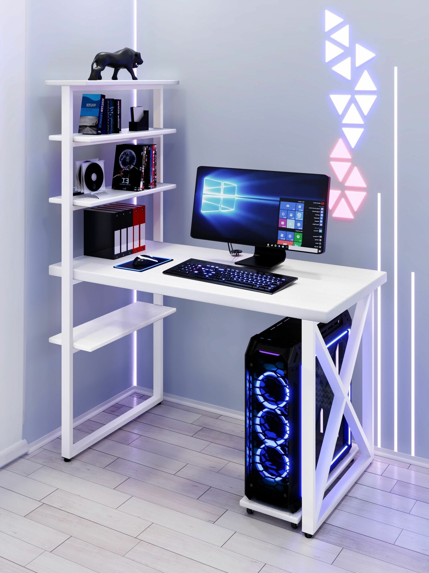 Стол компьютерный Loft с пятью полками, столешница голубого цвета из массива сосны 40 мм и белые металлические крестообразные ножки, 110х60х148 см
