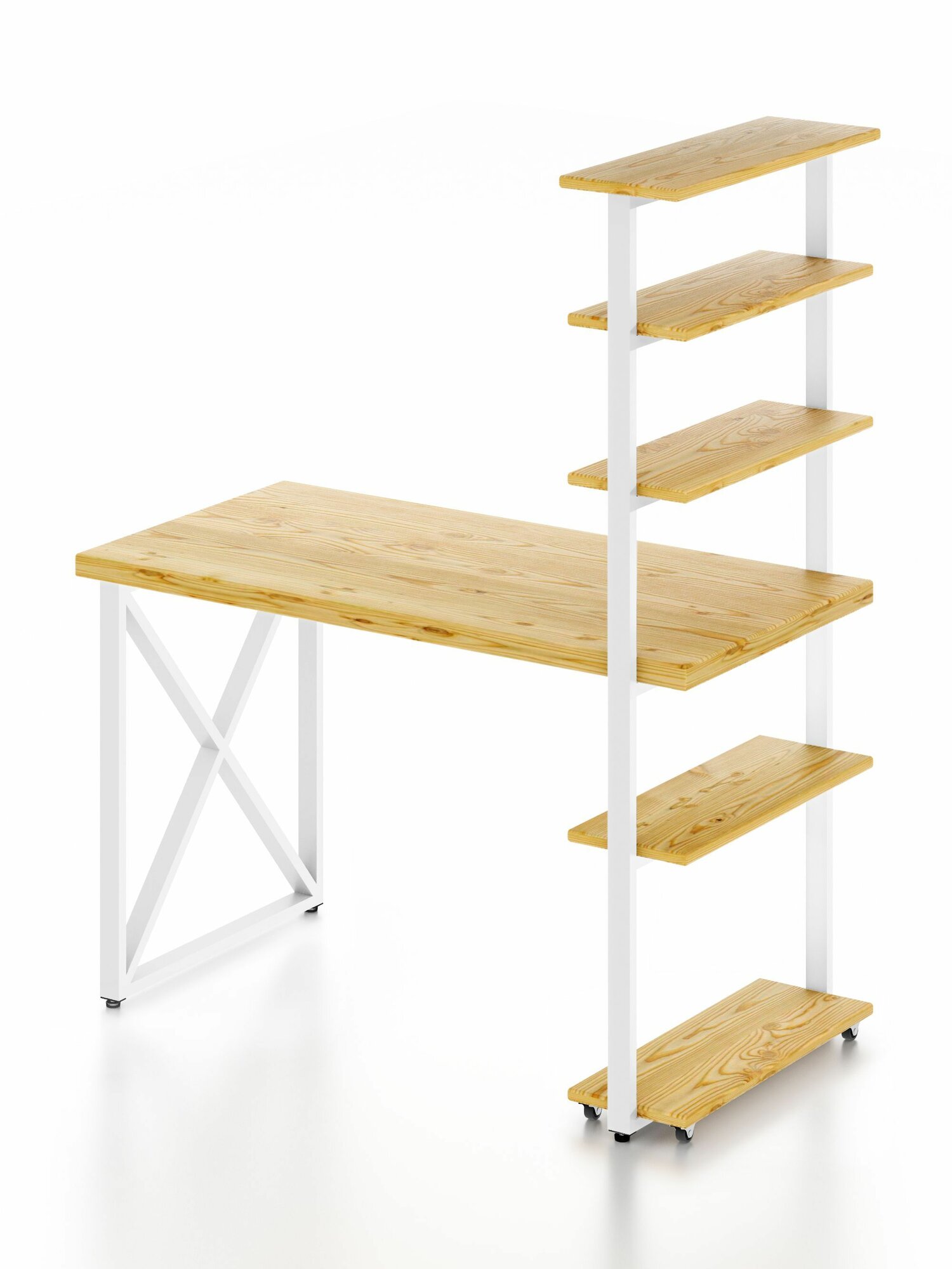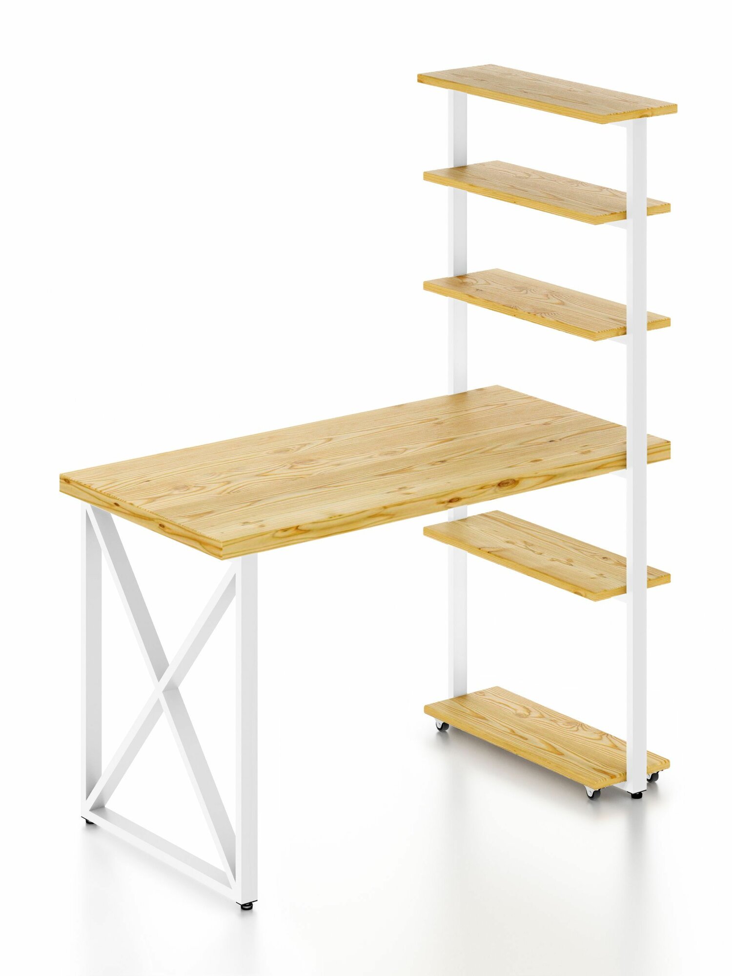 Стол компьютерный Loft с пятью полками, столешница без покраски из массива сосны 40 мм и белые металлические крестообразные ножки, 100х80х148 см