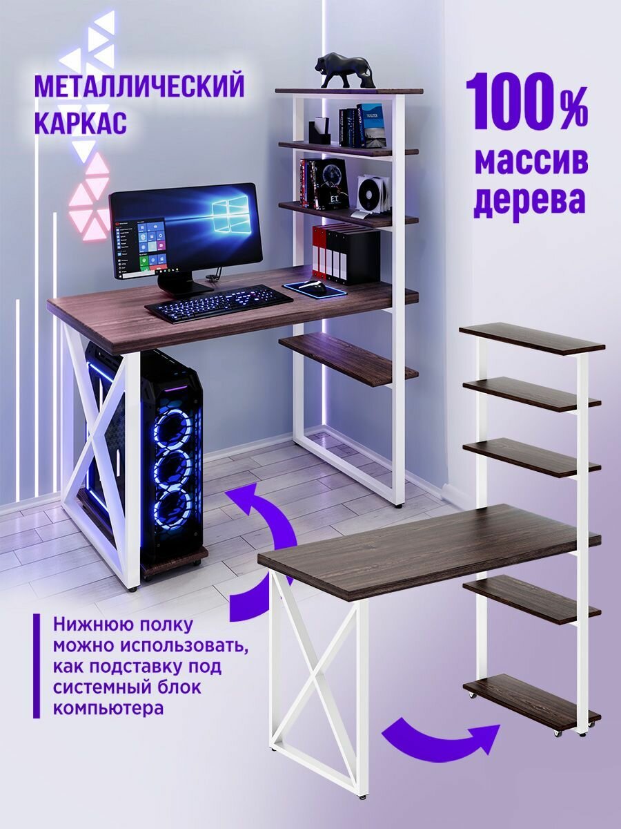 Стол компьютерный Loft с пятью полками, столешница цвета темного дуба из массива сосны 40 мм и белые металлические крестообразные ножки, 110х60х148 см