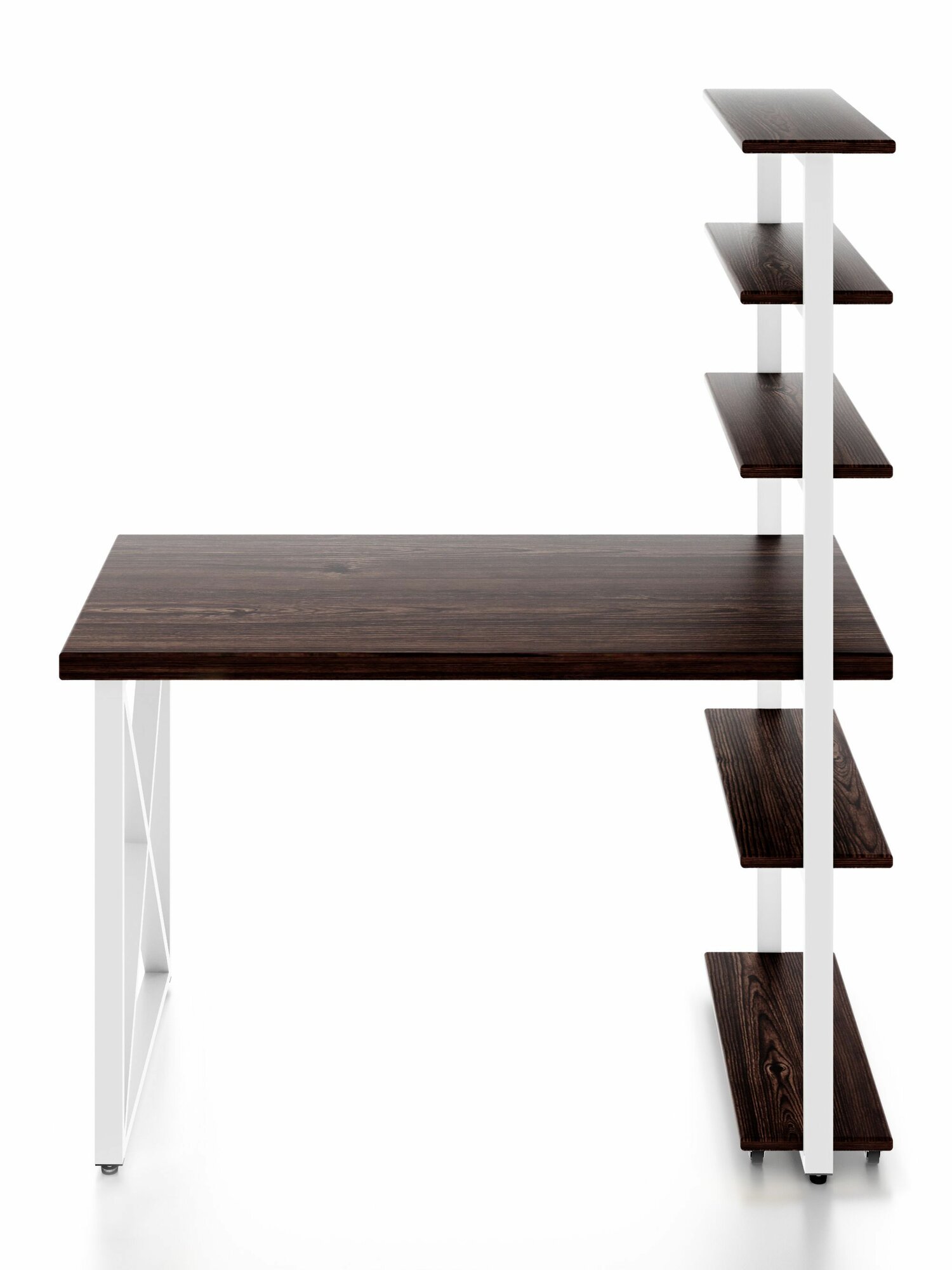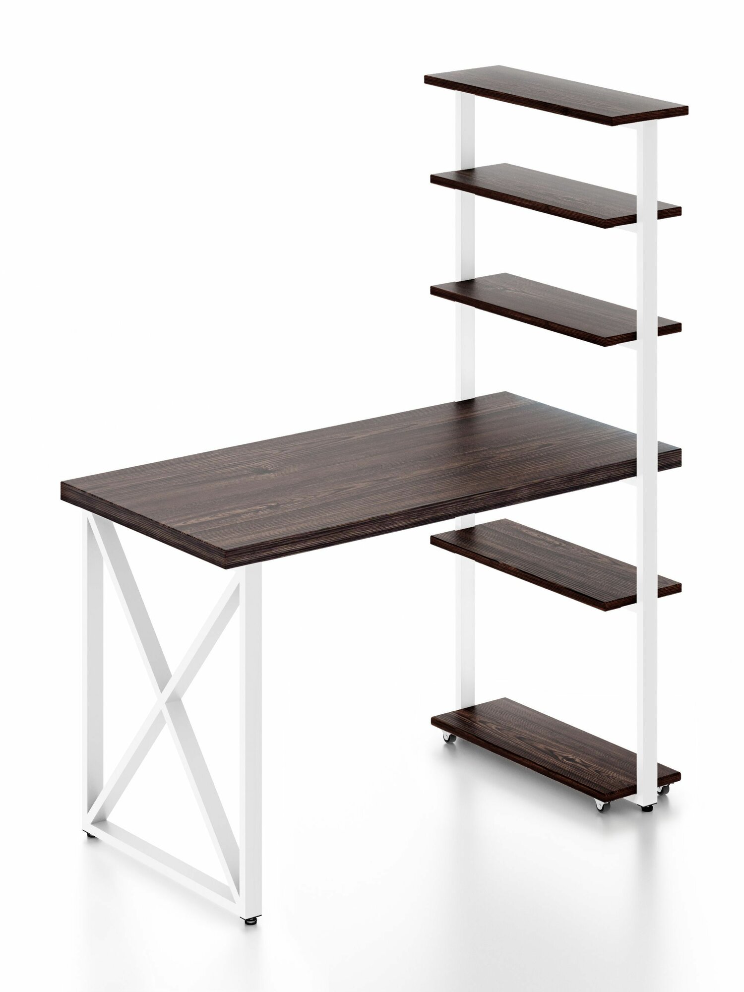 Стол компьютерный Loft с пятью полками, столешница цвета темного дуба из массива сосны 40 мм и белые металлические крестообразные ножки, 100х60х148 см