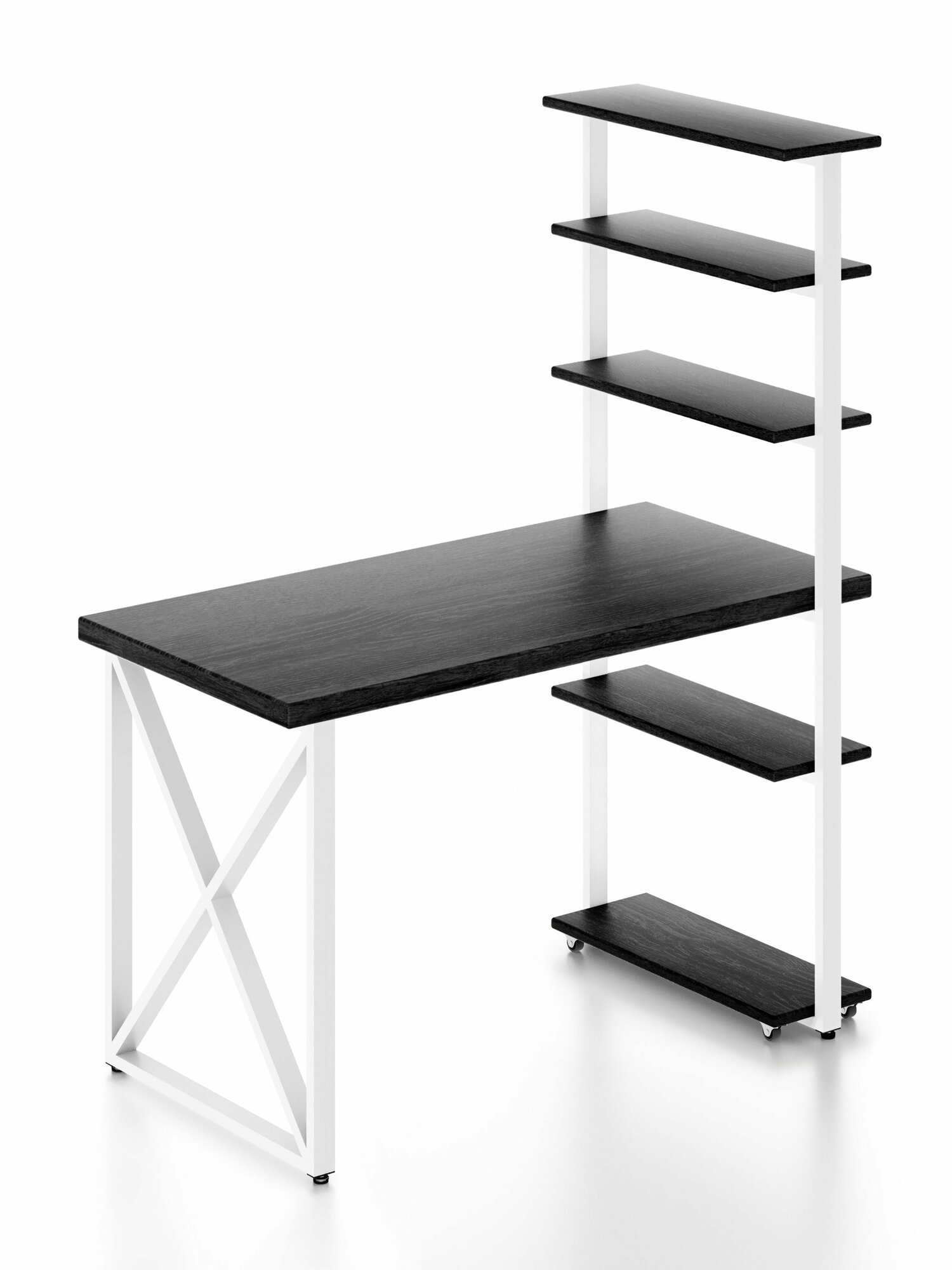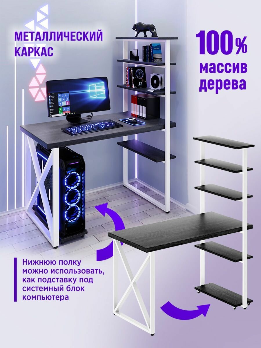 Стол компьютерный Loft с пятью полками, столешница цвета черного оникса из массива сосны 40 мм и белые металлические крестообразные ножки, 120х60х148 см