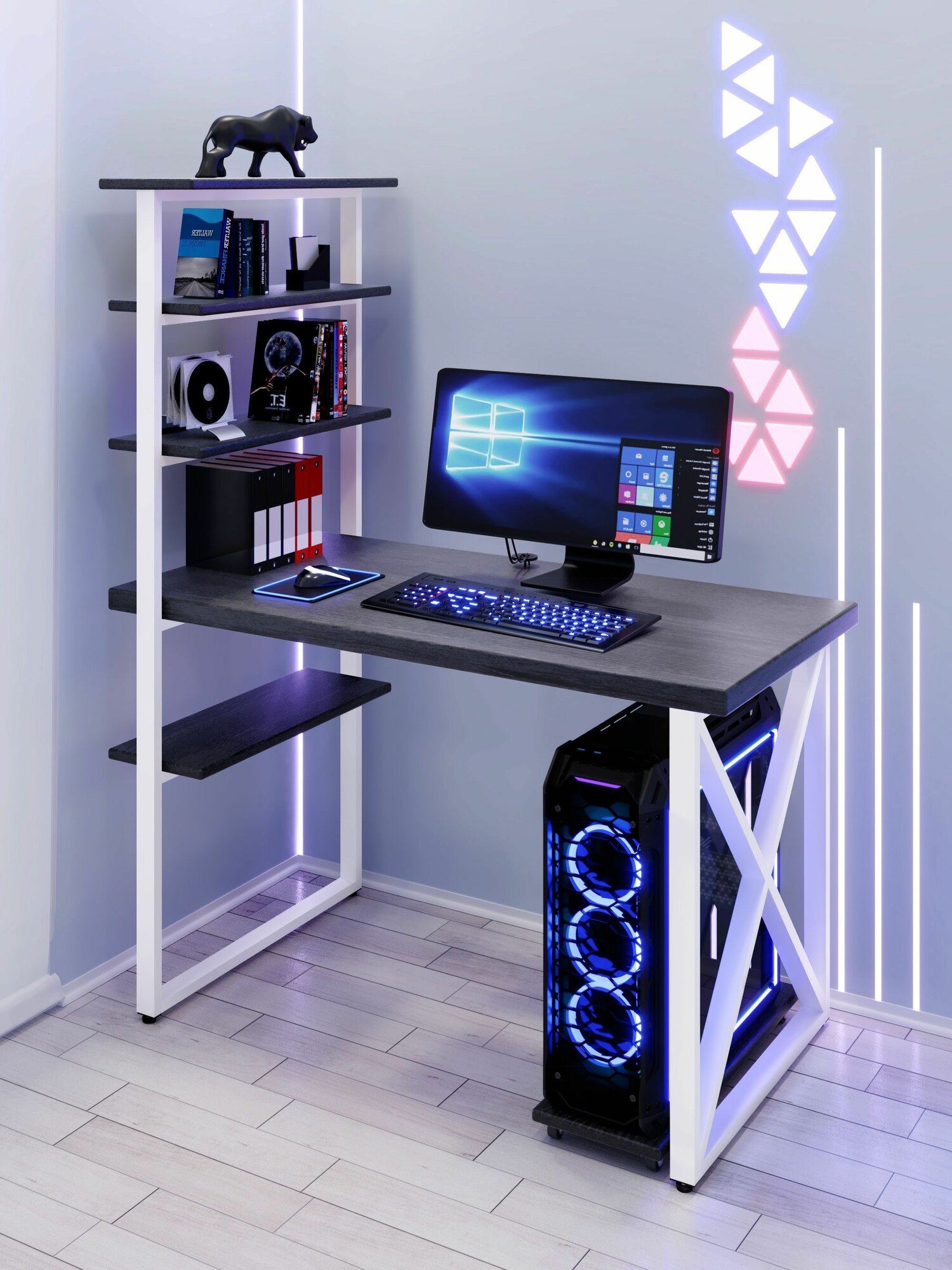 Стол компьютерный Loft с пятью полками, столешница цвета антрацит из массива сосны 40 мм и белые металлические крестообразные ножки, 110х80х148 см