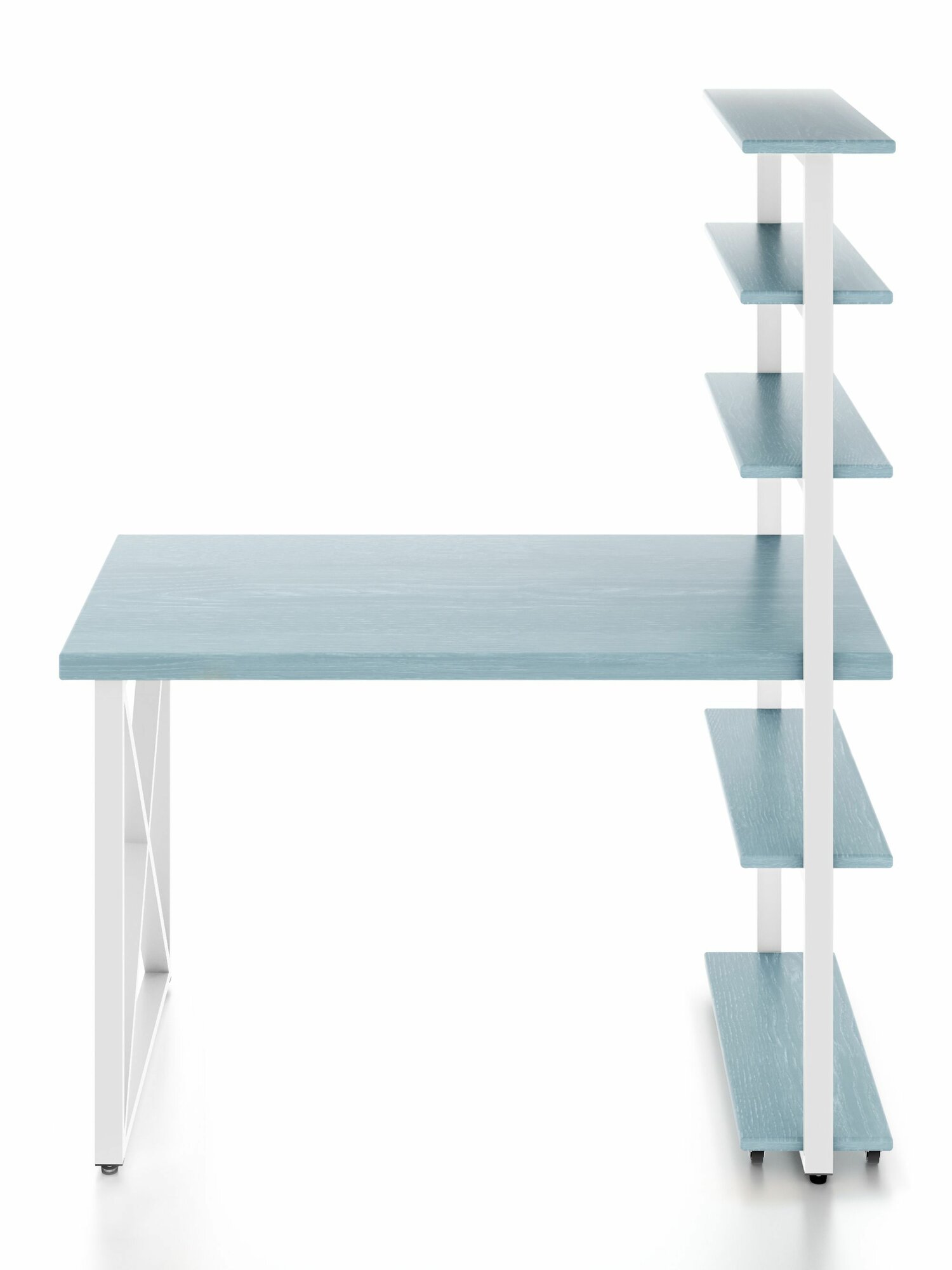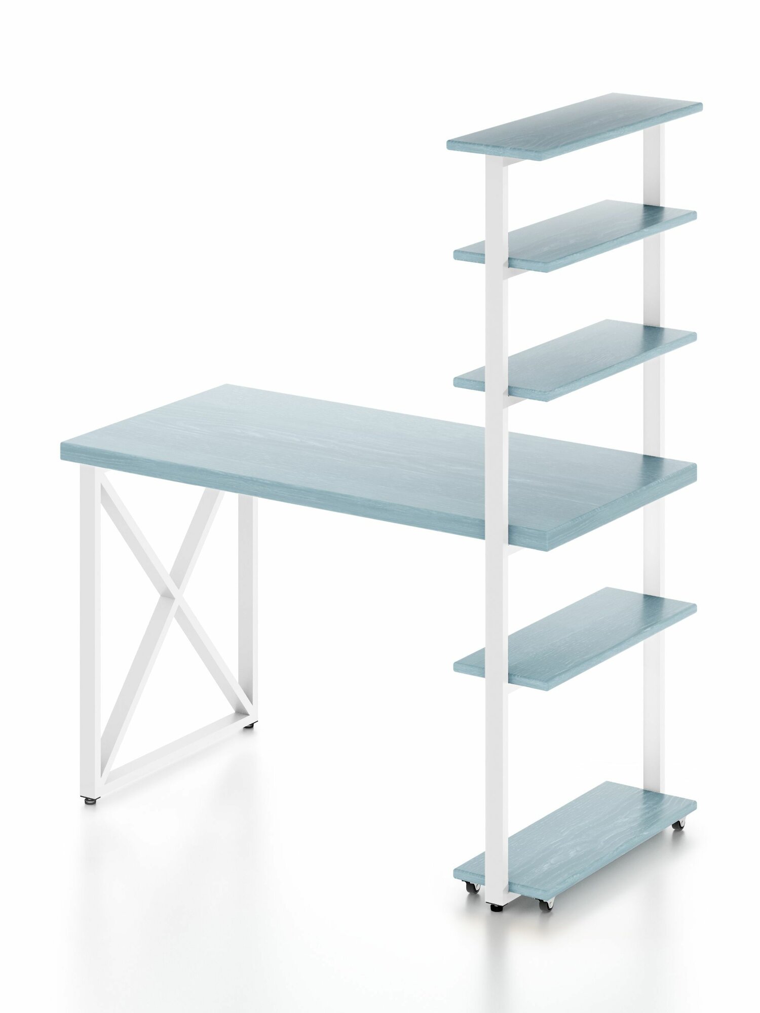 Стол компьютерный Loft с пятью полками, столешница голубого цвета из массива сосны 40 мм и белые металлические крестообразные ножки, 110х60х148 см