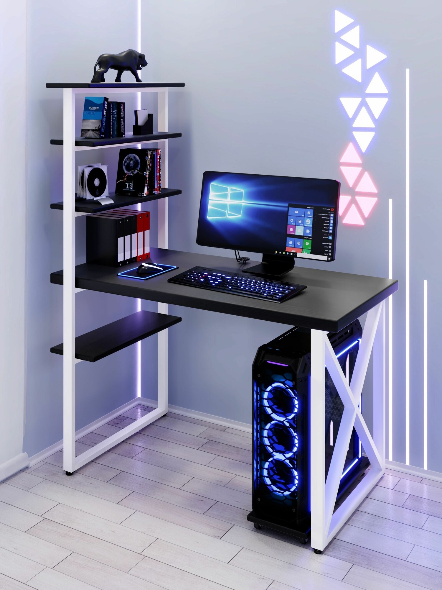 Стол компьютерный Loft с пятью полками, столешница цвета антрацит из массива сосны 40 мм и белые металлические крестообразные ножки, 110х80х148 см