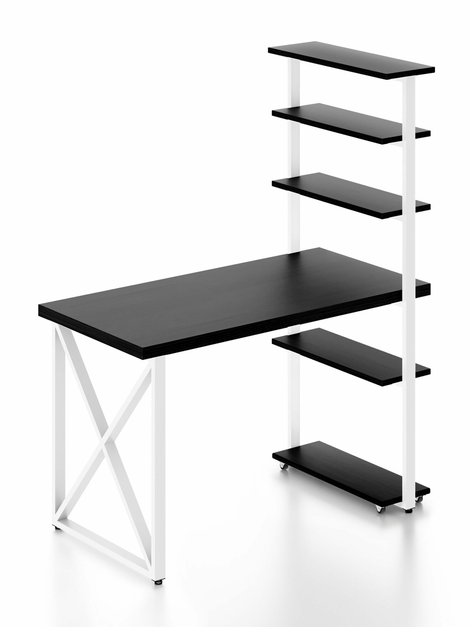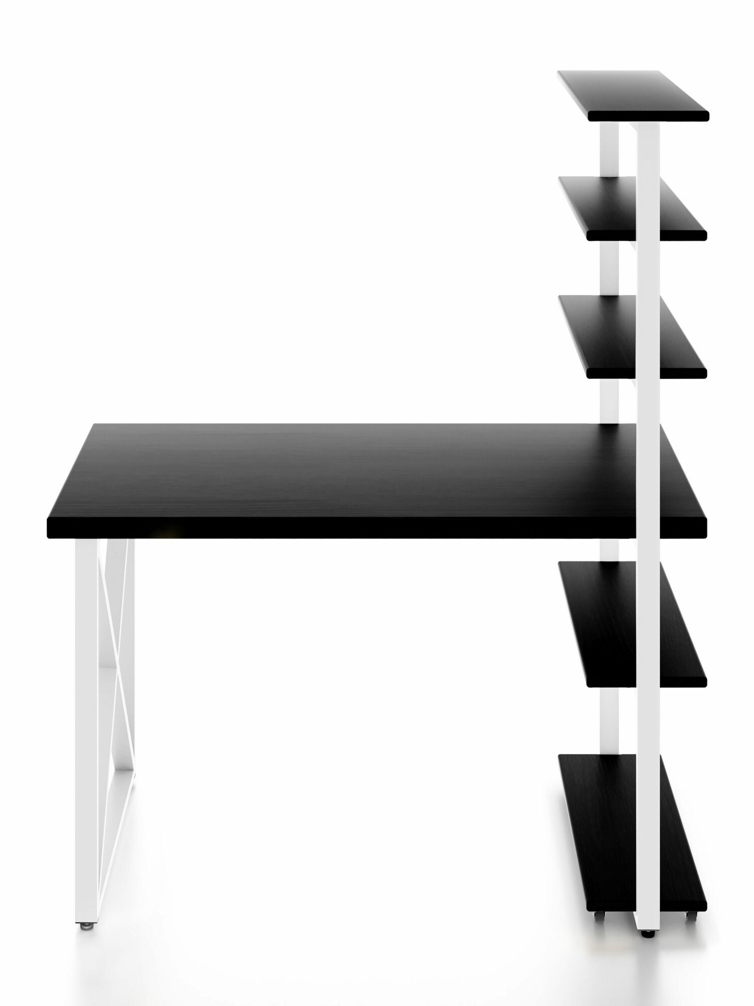 Купить Стол компьютерный Loft с пятью полками, столешница цвета черного оникса из массива сосны 40 мм и белые металлические крестообразные ножки, 120х60х148 см