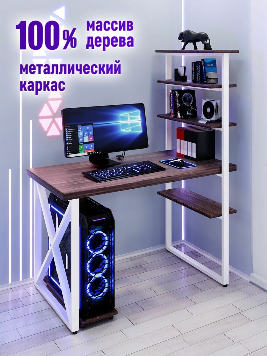 Стол компьютерный Loft с пятью полками, столешница цвета темного дуба из массива сосны 40 мм и белые металлические крестообразные ножки, 100х80х148 см