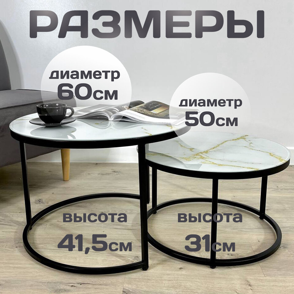Журнальный стол "Мартин" комплект круглый, 60х60х40 см Мрамор Белый с черными опорами